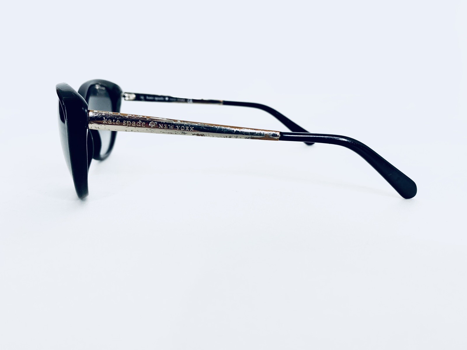 Kate Spade NY Black Cat Eye Sunglasses W Gold Temples Livia 0807 55 16 135. Condition is Pre-owned. Shipped with USPS First Class Package. G5-2-1 Kate Spade New York Livia 2/S 0807 Y7 55 16 135 Frame & lenses in excellent condition. No scratches on the lenses. The gold temples are a bit worn and shoes some discoloration in the metal. Ready to ship. Please take time to view photos carefully, and use your own judgment on appearance and condition along with what we have described. If you have any any questions please ask and We'll answer as best We can. Thank you.
