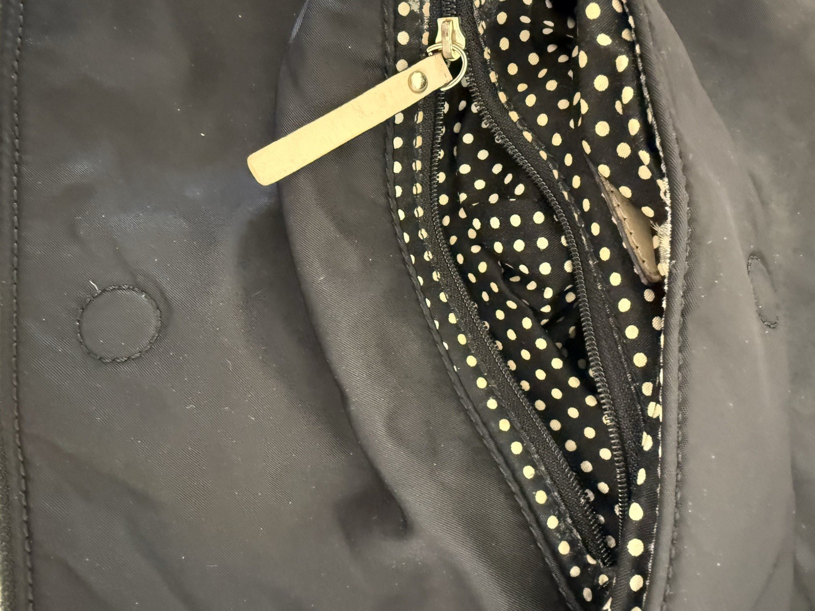Classic Kate Spade New York foldover crossbody in black nylon with beige leather trim and adjustable strap. Features gold-tone logo plate, front zip detail, secure top zipper closure, and signature black and cream polka dot lining with interior zip pocket. The bag is in excellent condition. The nylon exterior shows slight fading in areas, but the structure remains strong and durable. This is a very well-made, sturdy bag that still looks great and functions perfectly. The interior is absolutely clean. Zipper works smoothly, strap is secure, and hardware has light surface wear consistent with normal use. Lightweight, very comfortable to wear, and an extremely practical model — perfect everyday designer crossbody that holds its shape beautifully