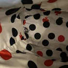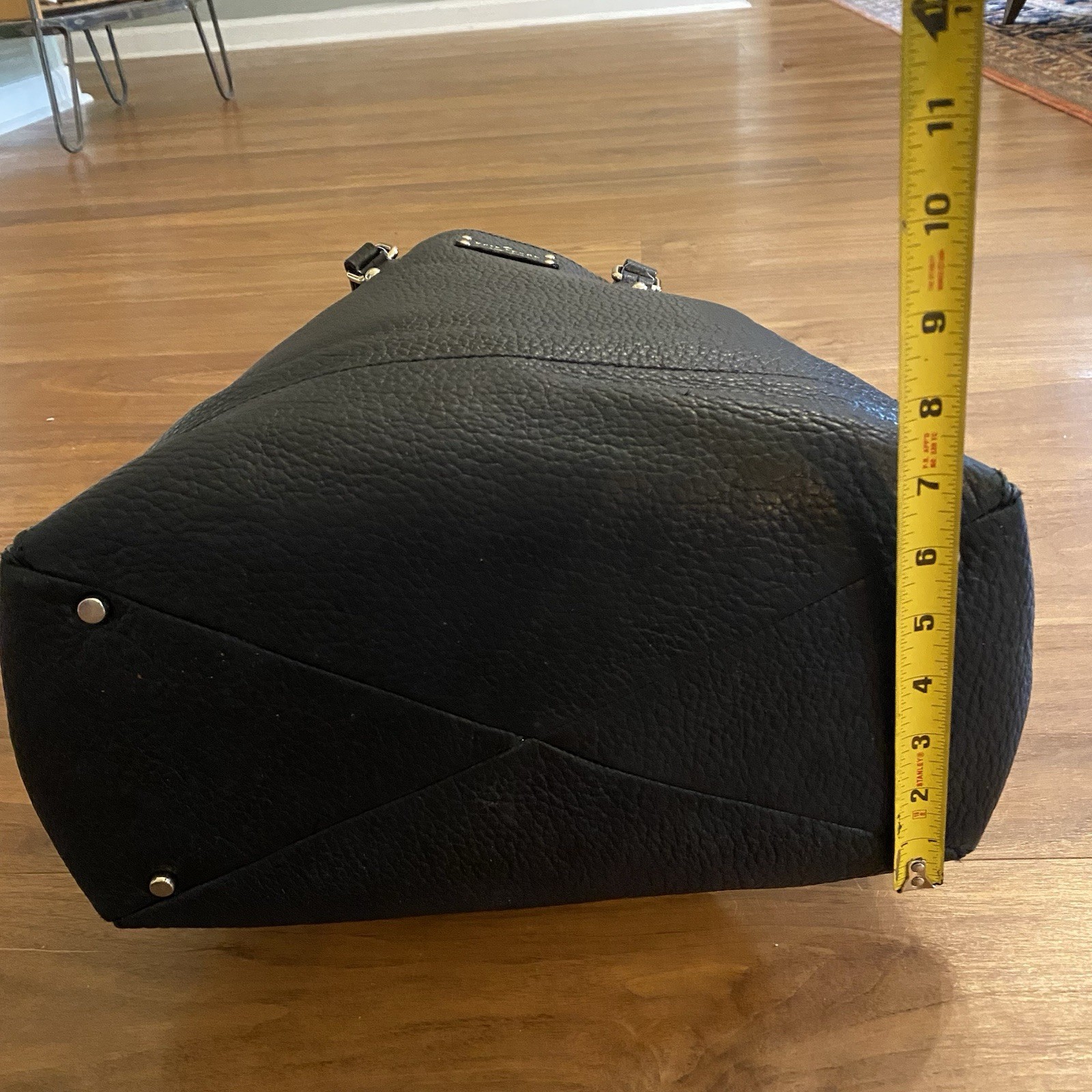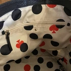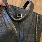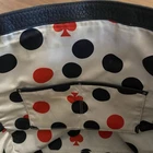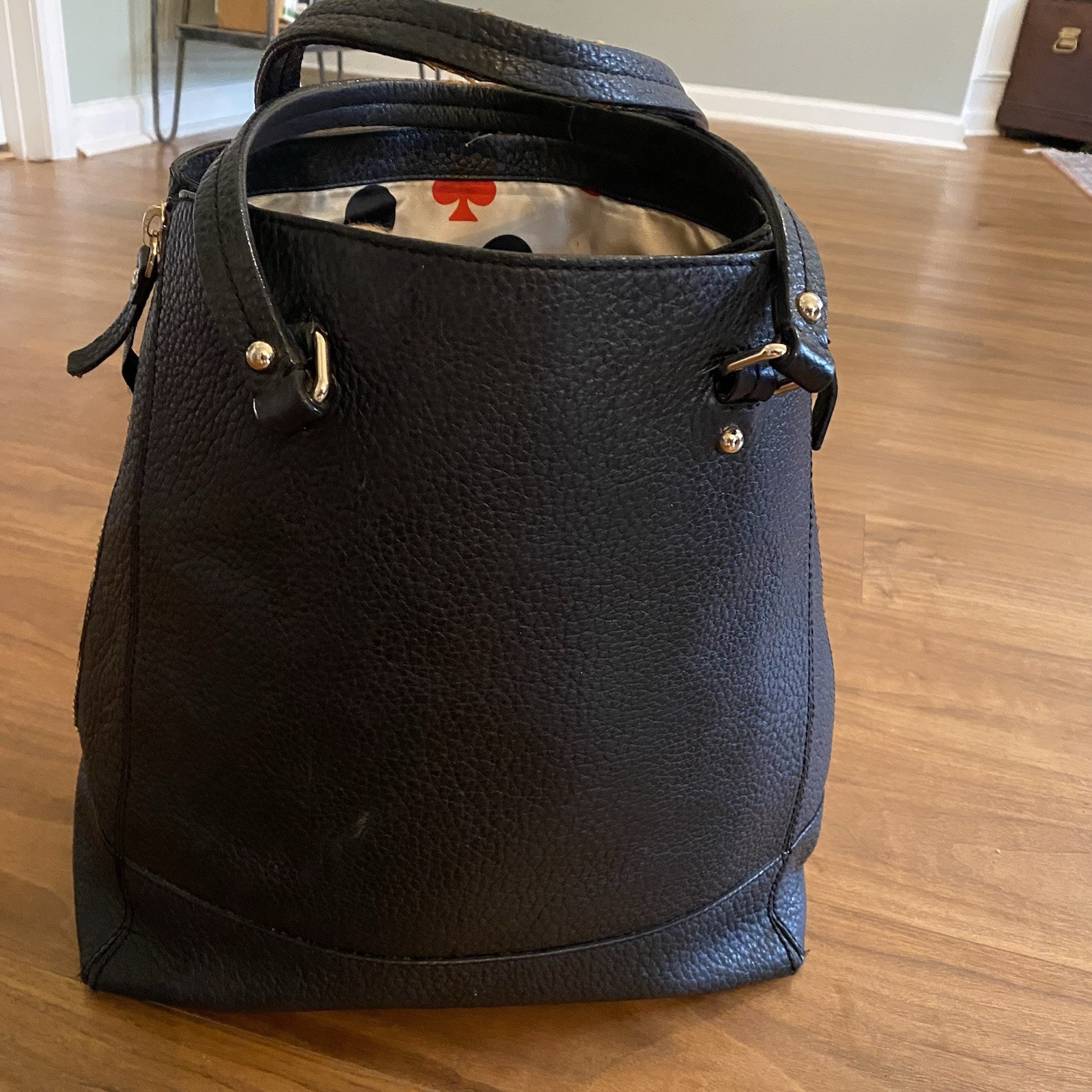 Brand: Kate Spade New York Style: Satchel / Tote Material: Pebbled leather Color: Black Hardware: Gold-tone Condition: Pre-owned, fair to good (see notes) Description: Kate Spade New York black pebbled leather satchel/tote with structured silhouette, dual top handles, gold-tone hardware, and front logo plate. Interior features the classic Kate Spade polka dot and spade print lining. Side zipper panels add visual detail and flexibility. Bag stands upright and includes metal feet on the bottom. ⚠️ Condition notes (important): • Top handles show noticeable wear with peeling/cracking along the edges, especially on the underside (see close-up photos) • Exterior leather body is otherwise in good pre-owned condition with normal wear • Interior lining shows wear/marks/stains (pictured) • Zippers, hardware, stitching, and structure remain intact Approximate measurements: • Width: ~13 in • Height: ~11 in • Depth: ~5 in Please review all photos carefully. Price reflects handle wear.