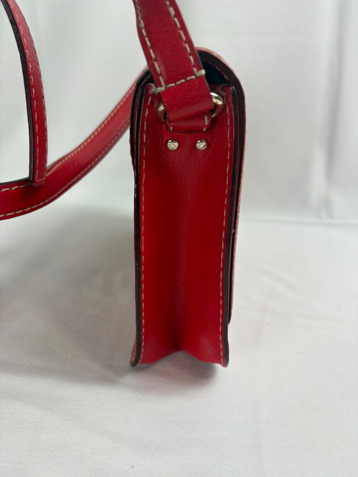 The Kate Spade New York Wellesley Flynn Crossbody Dot Lining Magnetic Close in Red is a stylish and practical purse for women on the go. This medium-sized crossbody bag features a solid red exterior with a pebbled finish and a beige fabric lining. The magnetic closure ensures your belongings are secure while the crossbody strap in red leather adds a trendy touch. The rectangular shape and silver hardware give this bag a chic and sophisticated look, perfect for adding a pop of color to any outfit. Made by the renowned brand, Kate Spade New York, this purse is a versatile accessory for any occasion.