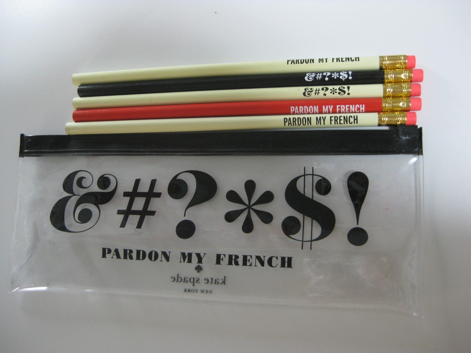 Contact us to see if we can ship this out earlier at no extra cost. Rare Pre-owned Kate Spade Pencil Set in Case 5 Wooden pencils with erasers in Kate Spade plastic case with ziploc type closure One end of case is glued with clear glue. Some pencils are inscribed with funny phrase, "PARDON MY FRENCH" and some " ?*$!" "Pardon my French" is a common English language phrase ostensibly disguising profanity as words from the French language; " ?*$!" also denotes swearing. When new with more pencils, it retailed for $78.