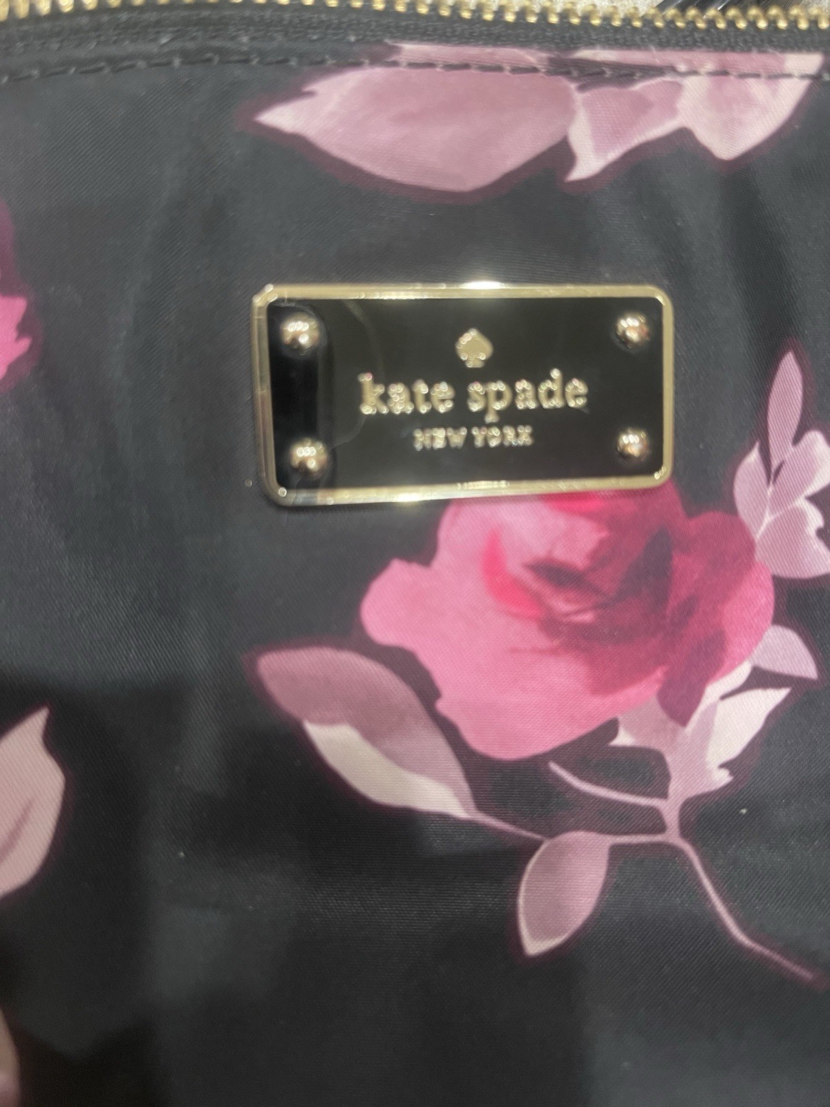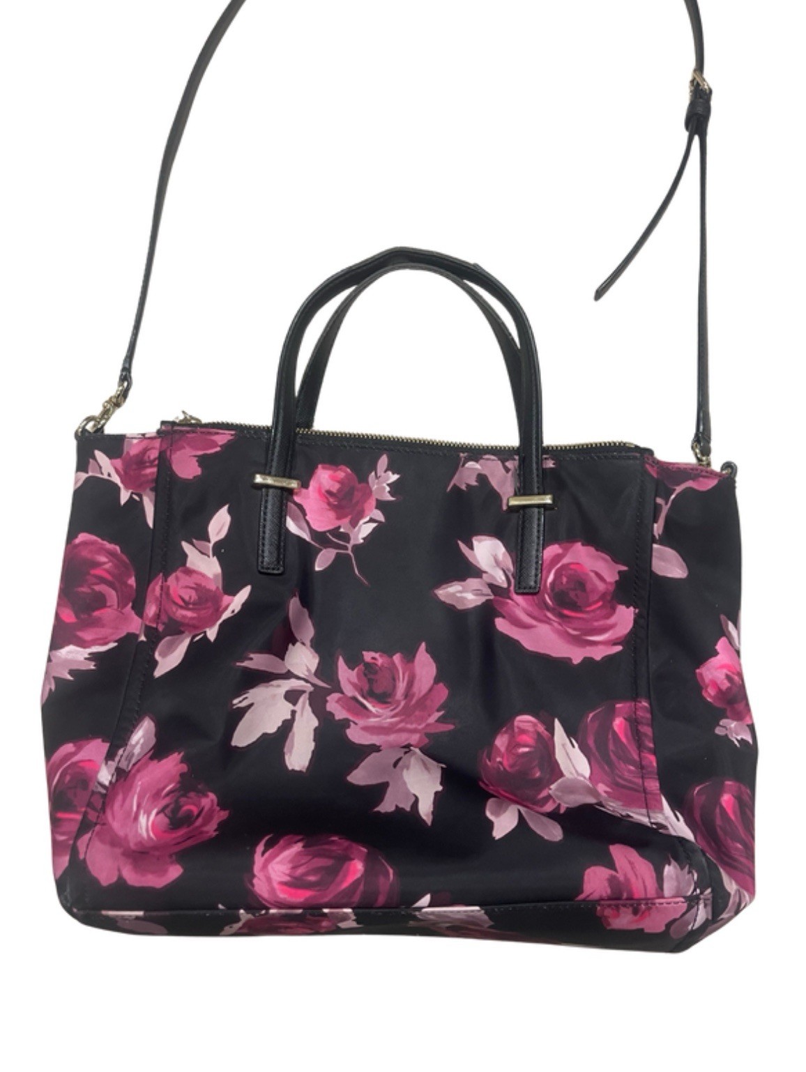 The KATE SPADE Wilson Road Rose Symphony Alyse Satchel Tote in Black Pink Floral is a stylish and versatile bag perfect for women. Featuring a floral pattern, rectangular shape, and gold-plated hardware accents, this medium-sized satchel/top handle bag offers both fashion and functionality. The black nylon exterior with a fabric lining and inner pockets adds a touch of sophistication, while the detachable black leather handle/strap provides easy versatility for everyday use.