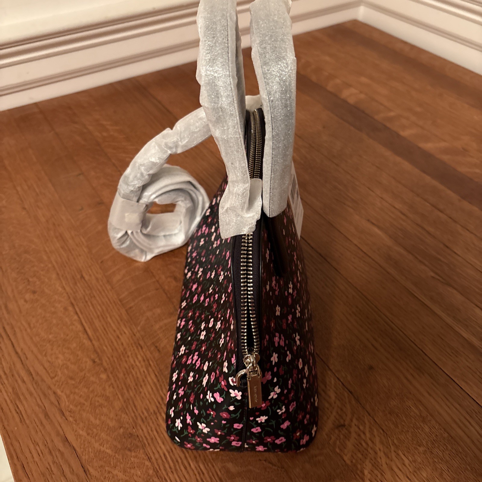 The Kate Spade Schuyler Medium Dome Satchel in Black Floral is a stylish and versatile handbag perfect for various occasions. This medium-sized satchel features a dome shape, zip closure, and double black handles with a 4-5 inch drop. The exterior is made of PVC material with a saffiano finish, while the interior is lined with jacquard material and includes inner pockets and an adjustable strap. The bag also features gold-plated hardware for a touch of luxury. Ideal for travel, weddings, parties, or everyday use, this satchel is a practical yet fashionable choice for any woman.