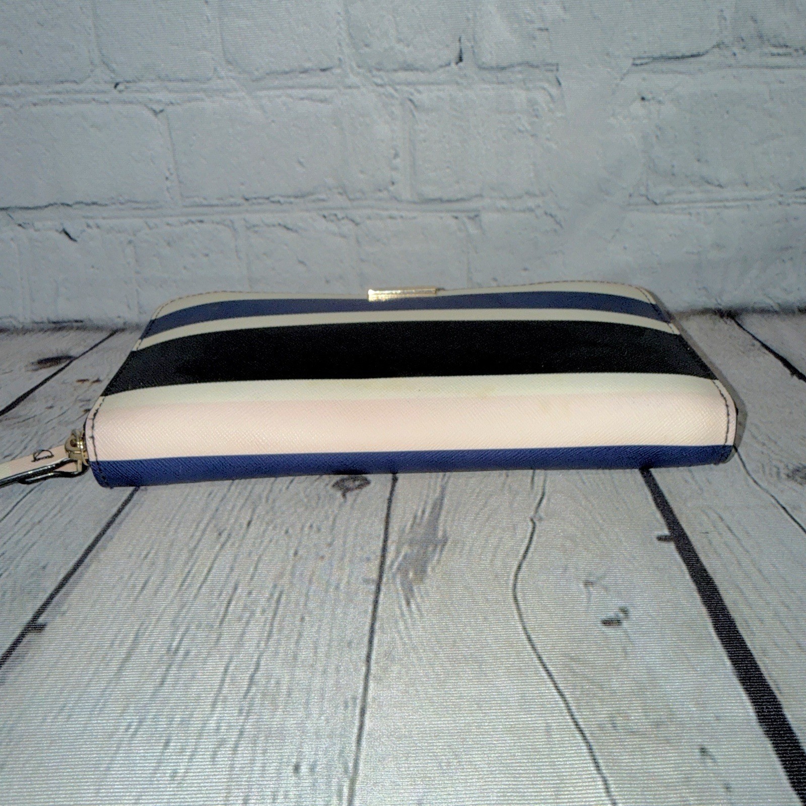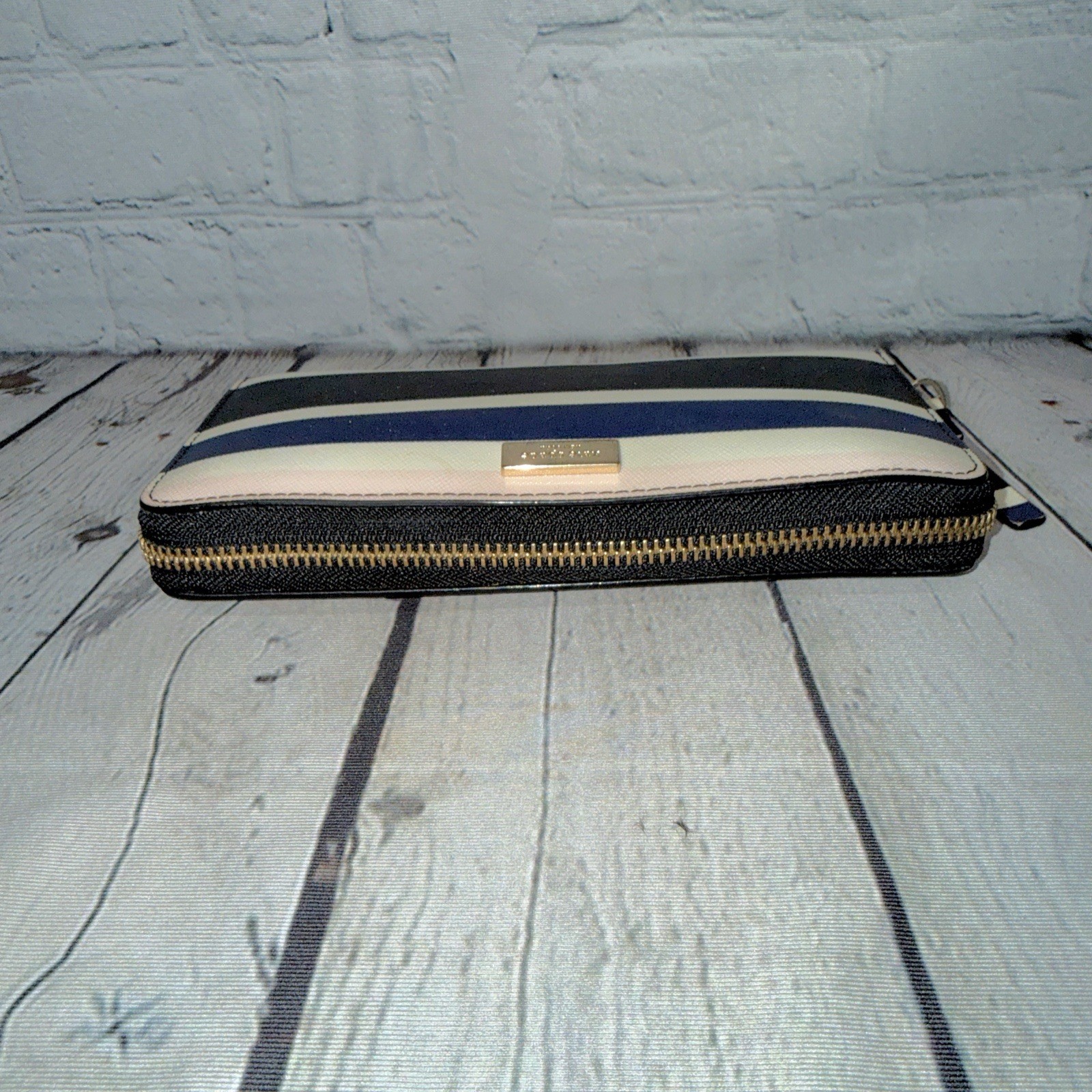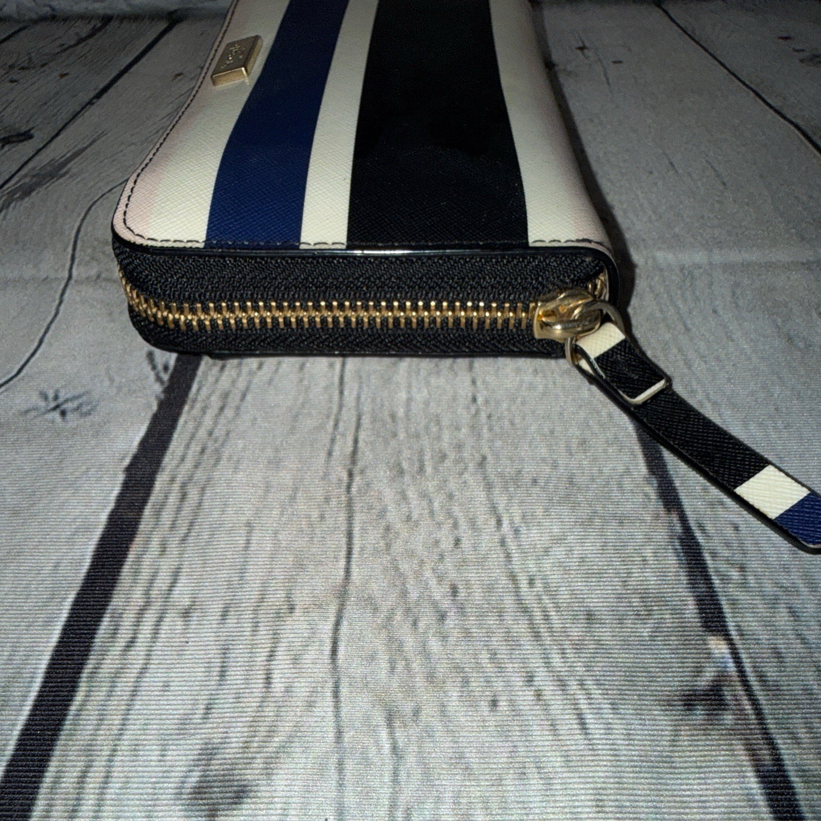Kate Spade zip around wallet in off white, black, navy blue, & pale pink stripes. Saffiano leather. Gold tone hardware. Brand plate on front. Slip pocket on back. 3 side zip around close. Inside lined with black fabric/black leather & includes multiple slip pockets, a zip close change compartment, & ample storage. 4.25” x 7.75” x 1.25”D Light discoloration on white stripes in some areas as shown (hard to see unless looking for it). Otherwise perfect condition!
