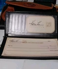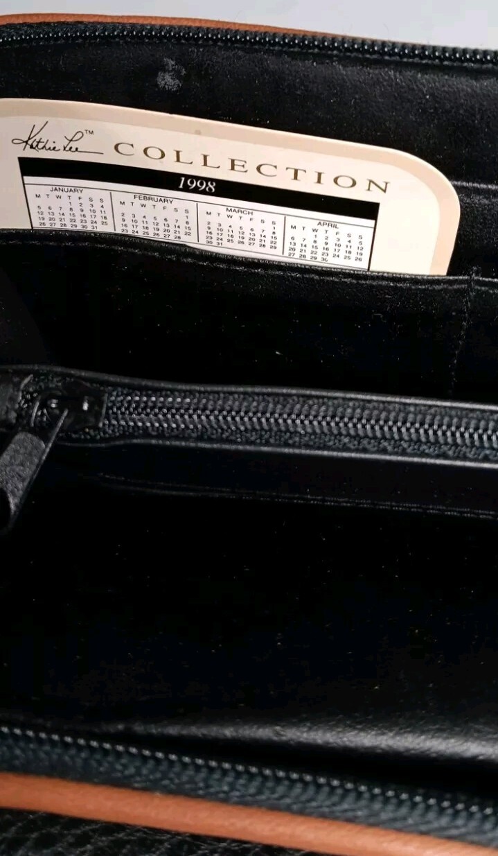 NEW from 1998. This Kathie Lee Collection wallet is a classic addition to any wardrobe. The black and brown color combination is timeless, while the faux leather material gives it a stylish touch. With a solid pattern and logo accents, this wallet is perfect for any occasion. It features a pouch design with plenty of credit card slots, checkbook, key chain, and folding compartments, making it practical and functional. The wallet is 8 inches long and 4 1/2 inches wide, making it the perfect size for everyday use. This vintage-inspired wallet is a must-have for any woman looking for a classic accessory.