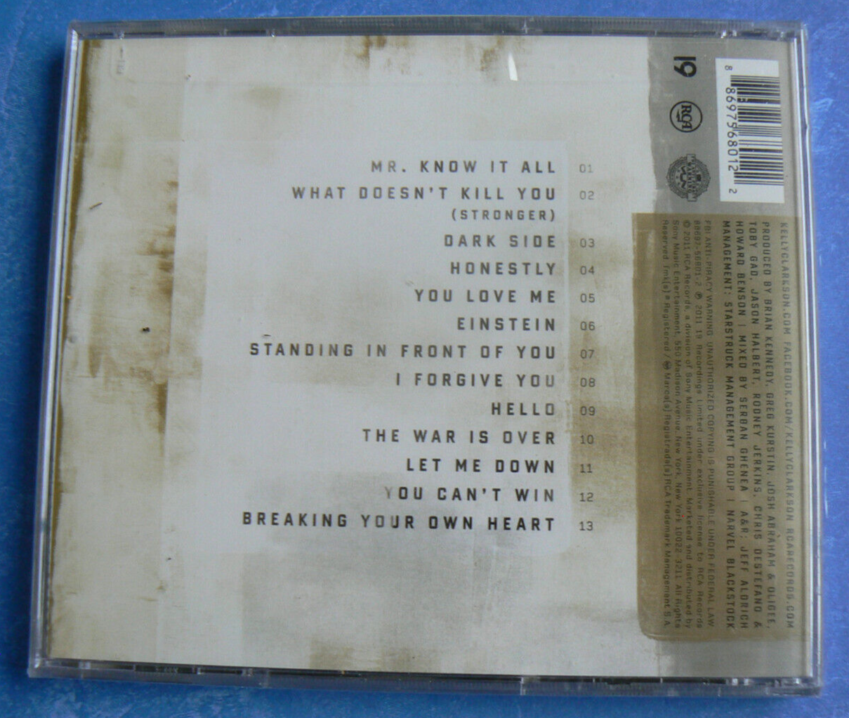 This listing is for a BRAND NEW, still-sealed CD. Kelly Clarkson: STRONGER This CD contains 13 tracks CD contained within a plastic jewel case. Please see the last photo for the songs included on this disc. This will ship using media mail, unless you'd like to upgrade to first class or priority. ~~~~~~~~~~~~~~~~~~~~~~~~~~~~ I normally mail ON the day I receive payment if it's received before 1 p.m. central time, and the next day if it's later than 1. Please take a look at my other listings; I'm listing many school books (and other items) and am happy to combine shipping! Before you pay, put items in your cart, then "request total from seller". I will then weigh them together and send an invoice with a combined shipping price. Items from smoke-free, pet-free home. Thanks so much for your time! Before leaving your feedback, if for any reason you feel I did not deserve or earn 5 stars in each category, please let me have the opportunity to make it right. I want every transaction to be 5-star worthy! Thanks so much! :)