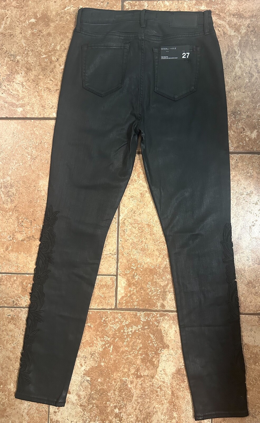 Turn heads and make a statement with the Kendall + Kylie “The Stiletto” polished black skinny jeans! These high-rise super skinny stunners are the epitome of edgy sophistication. Crafted for a flawless fit, they hug your curves in all the right places while exuding a sleek, leather-like sheen. The standout feature? Elegant lace floral details running along the front of each leg, adding a touch of romantic charm to their bold, modern vibe. Perfect for a night out or dressing up your everyday look, these jeans are as fun and flirty as they are effortlessly chic.