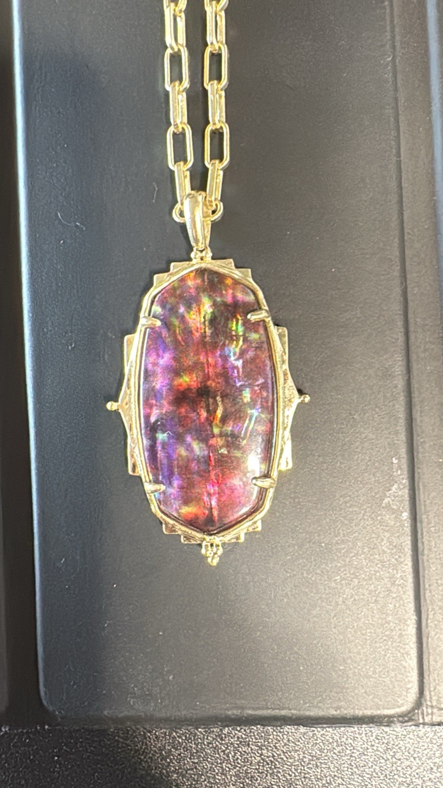 The Kendra Scott Baroque Ella Pendant Necklace in Gold plated Veined Purple Magnesite is a stunning piece of jewelry designed for women. Beautiful in gold plating over bronze and a unique pendant style, this necklace features a beautiful purple magnesite stone as the main focal point. The pendant sparkles & reflects a kaleidoscope of colors. The 30” plus 2” extender makes it a versatile piece that can be worn with a variety of outfits to add a touch of elegance and style. Perfect for those who appreciate high-quality craftsmanship and a bold, eye-catching design. Thank you for shopping Stellar Chic Boutique! Feel free to send offers or ask questions. =)
