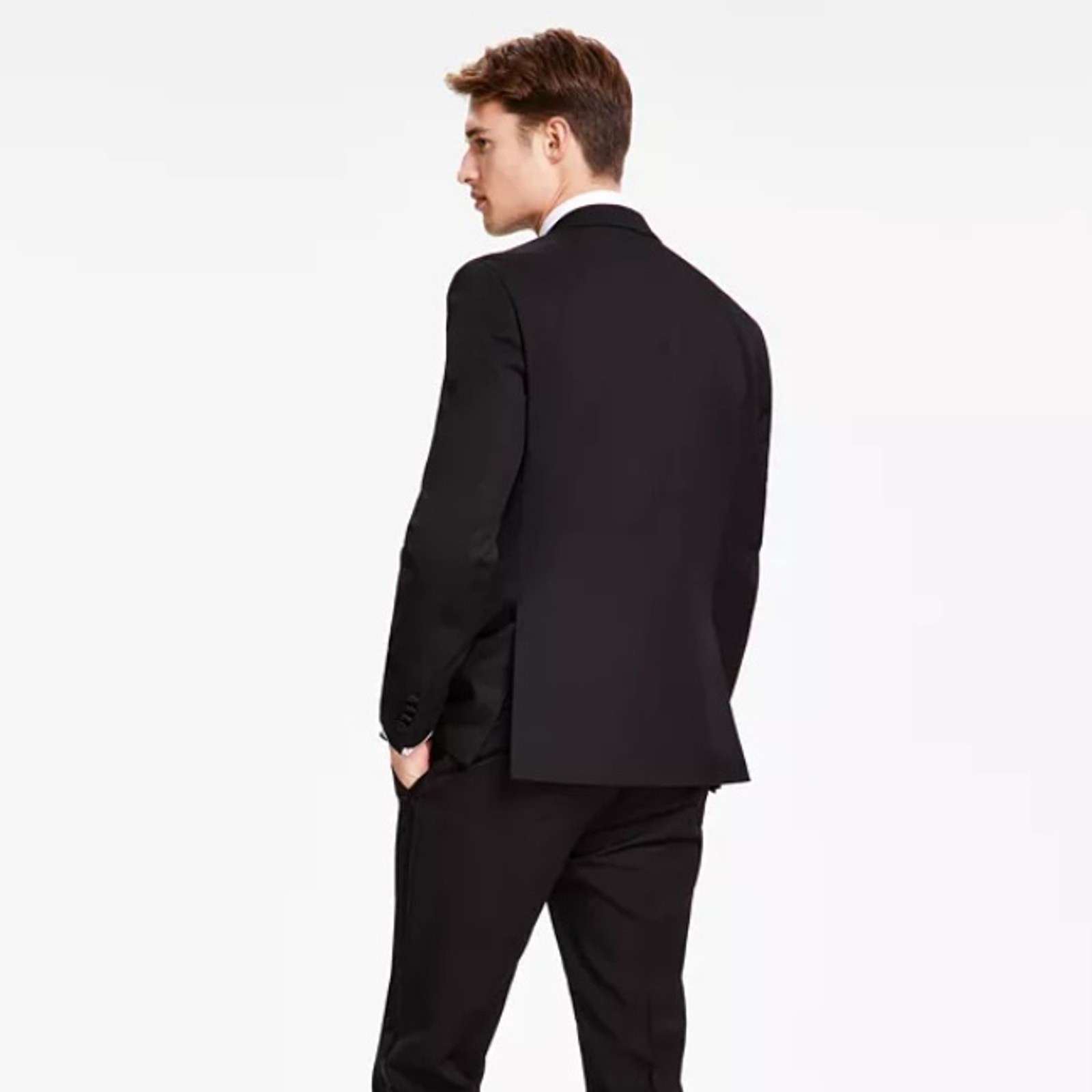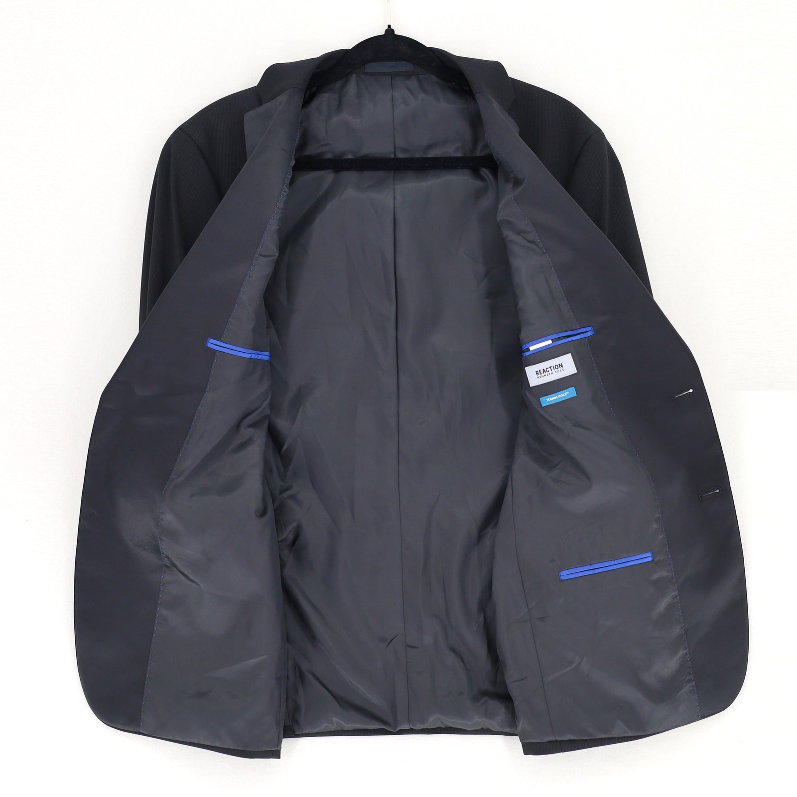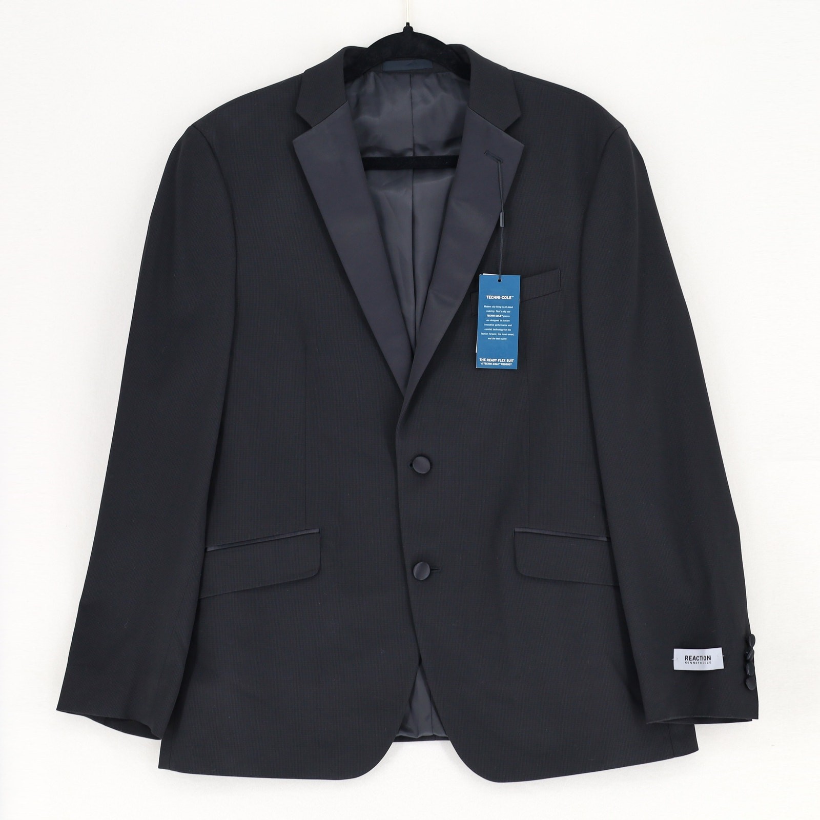 Kenneth Cole Reaction Blazer Men's Black Techni-Cole Classic Slim-Fit Size 38R New with tags Originally sold as a suit with MRSP $425. I sell only blazer Techni-Cole suit jacket in a stylish slim silhouette Flex performance fabric Notched lapel Side vents Fully lined One left chest welt pocket Two lower front angled flap pockets Three interior pockets Two-button closure Decorative buttons at cuffs 89% polyester / 9% rayon / 2% spandex Dry clean only Length 29" Armpit to armpit 19.5" Shoulders 17" Sleeve 25"