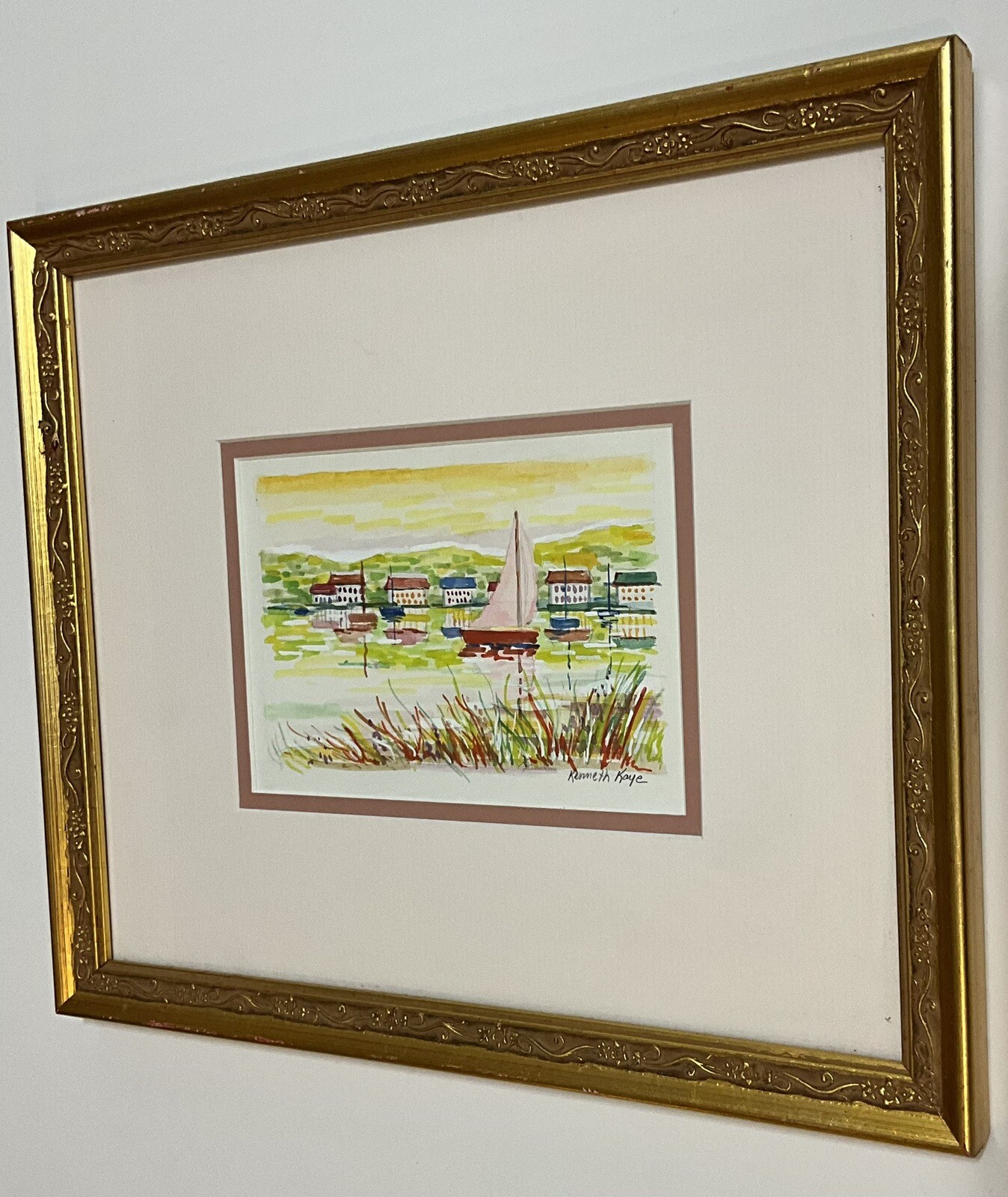 Kenneth Kaye’s original watercolor painting captures a serene bayfront scene, featuring a tranquil landscape with water and a sailboat. The 11“ x 13“ artwork is presented in a matted frame with glass, showcasing the artist's hand-signed piece. It's a one-of-a-kind creation that reflects Kay's style and vision, depicting the charm of bayside homes and sailboats. The painting is a contemporary piece from the 1980s, produced with skillful watercolor techniques on paper, and it stands out with its handmade quality. The piece is perfect for those who appreciate art with a coastal or bayfront theme, adding a touch of tranquility to any space. Price of $300 asking $149