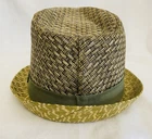 The Kenny K Natural Fiber Trilby Hat in Men's Large is a stylish fedora hat featuring a two-tone neutral color with green trim. This hat features an intricate and stylish geometric weave and striped ribbon trim. A classic accessory! Great Condition!
