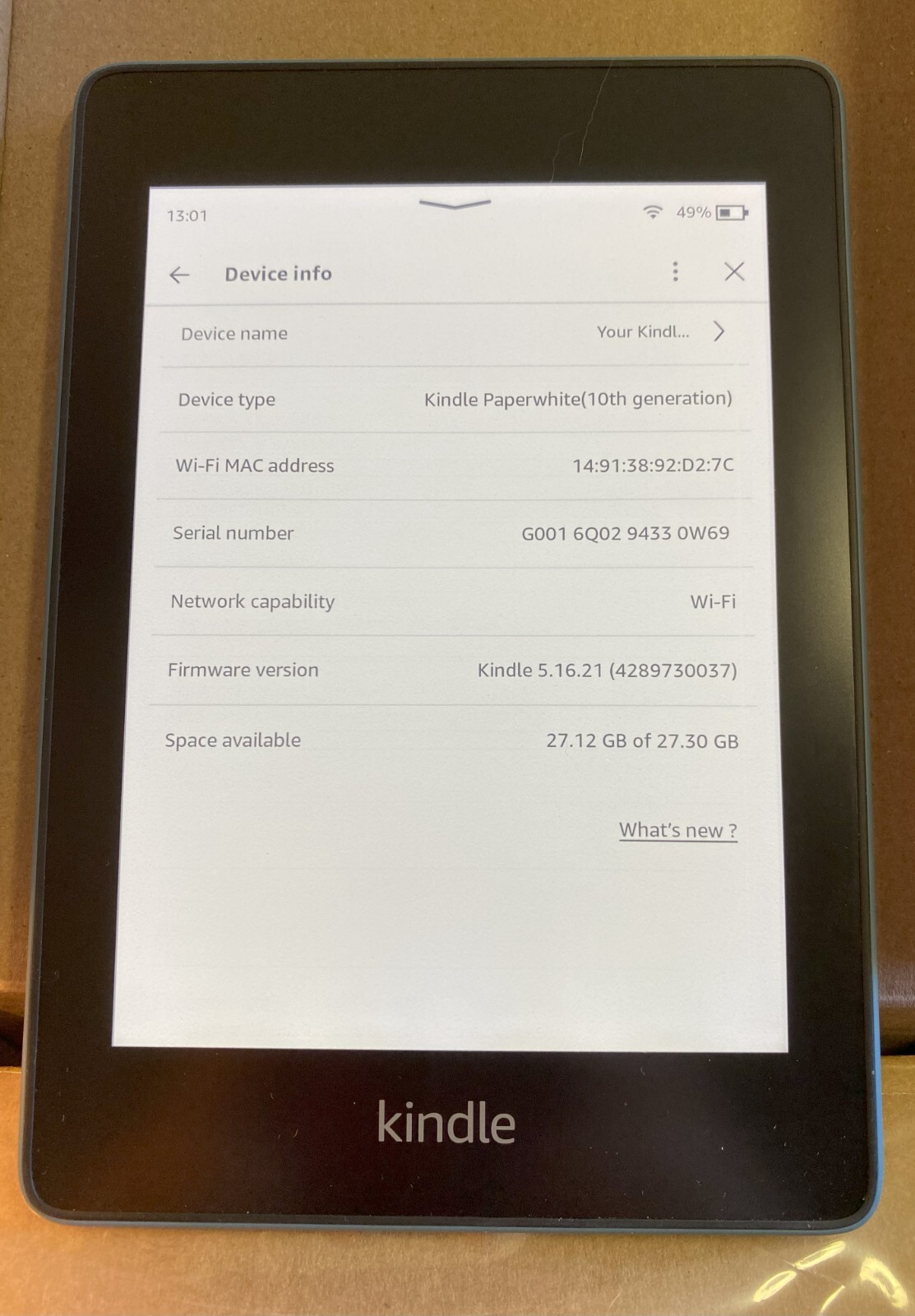 This Kindle Paperwhite Gen 10 2018 is a great choice for those looking for a high-quality tablet. With a 6-inch screen size and maximum resolution of 300 ppi, this device is perfect for reading and watching videos. Its storage capacity of 32 GB provides ample space for storing your favorite files and documents. The tablet comes in a Twilight Blue color and is designed by Amazon, a trusted brand in the technology industry. It also features Wi-Fi internet connectivity and weighs only 6.4 ounces, making it easy to carry around. Whether you're using it for work or entertainment, this Kindle Paperwhite is sure to impress. This unit is a Used Amazon Devices are fully functional pre-owned units that have been tested and verified by Amazon to meet specified used cosmetic criteria. Used Amazon Devices may be packaged in generic Amazon-branded boxes. This device is not accompanied by a manufacturer’s warranty. This item is in Used condition and may have very minor to small cosmetic imperfections associated with regular use. The thinnest, lightest Kindle Paperwhite yet—with a flush-front design and 300 ppi glare-free display that reads like real paper even in bright sunlight. Now waterproof, so you’re free to read and relax at the beach, by the pool, or in the bath. Your Kindle has been tested to withstand accidental immersion in water. Enjoy at 32 GB get 4 Xs the storage to hold magazines, comics, and audiobooks. Now with Audible. Pair with Bluetooth headphones or speakers to listen to your story. A single battery charge lasts weeks, not hours. Able to read Kindle Formate 8 (AZW3) Kindle AWZ, TXT, PDF, unprotected Mobi, PRC natively, HTML. PMP thru conversion. USB 2.0 charging cable included
