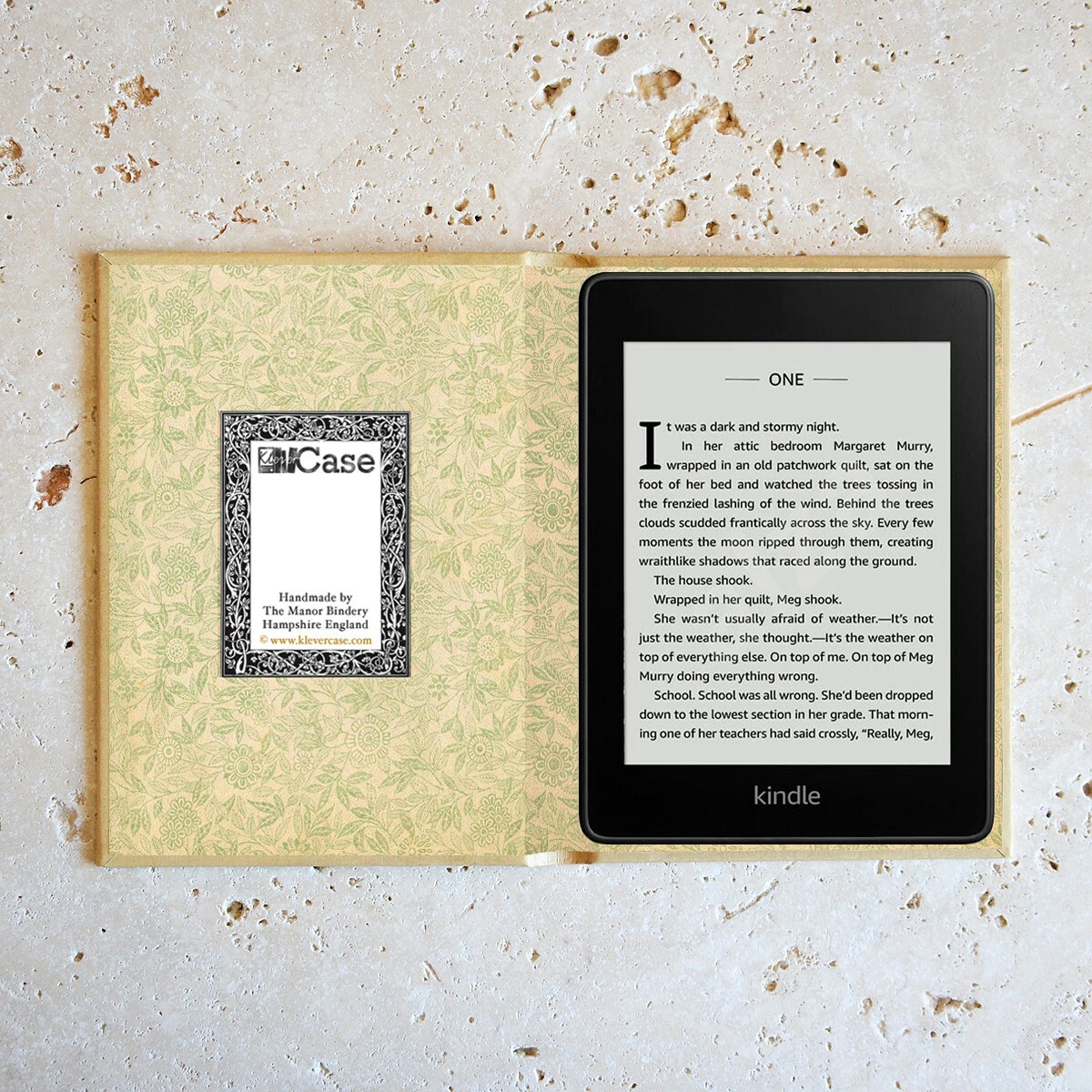 Key Features New Foldback Cover design specifically made for ALL Kindle Paperwhite and standard Kindle eReaders (inc new Kindle Paperwhite models with 6.8 inch screen). PLEASE NOTE: This case no longer has a plastic holder inside (see video) in order to work with ALL kindle eReaders - please ignore reviews before this time. Works using new slim velcro grip technology with ANY kindle or branded eReader within 185mm x 130mm x 20mm in size. Precision printed hardback book covers with hidden Magnet Closure that also keeps cover in position when the case is folded backwards. Does not have auto sleep/wake as each device has different magnet positions for this function. Practical, lightweight, durable matte laminated splashproof hardback book kindle cover. Handmade in England using high quality UK sourced materials and traditional bookbinding techniques. Description A beautiful vintage hard back book style ereader and tablet cover handmade in England using 40 years of bookbinding experience. The perfect coming together of old books and new technology make this the ideal gift for kindle and ereader owners that miss the feel of a book in their hands. We use a state of the art hook and loop Grip material (used on NASA spacesuits) that holds the device in place when in use but can also allow for it to be removed and replaced over and over again. Simple to apply and can be removed from the device at any time without leaving a residue. this method is allowing us to become plastic free and has been tested on successfully on over 20,000 orders. PLEASE NOTE: Works with ALL Kindle Paperwhite devices including 2021 11th gen models with a 6.8 inch screen and ANY branded kindle or ereader up to 185mm x 140mm x 20mm. All cases fold backwards for one-handed reading and include a strong hidden magnet closure that keeps the kindle cover closed in transit and also in position when the case is folded backwards. Made using locally sourced materials by highly skilled craftsmen and women in England, our cases are of the highest quality and have a lovely back story that makes them the ideal present and conversation piece. Each case is wrapped with a beautiful antique paper band as standard, for an extra special personal touch. PLEASE NOTE: Cases do not have sleep/wake functionality. Outer Cover Dimensions and Weight: 18.5cm x 13.0cm x 1.8cm - Weight: 200 grams