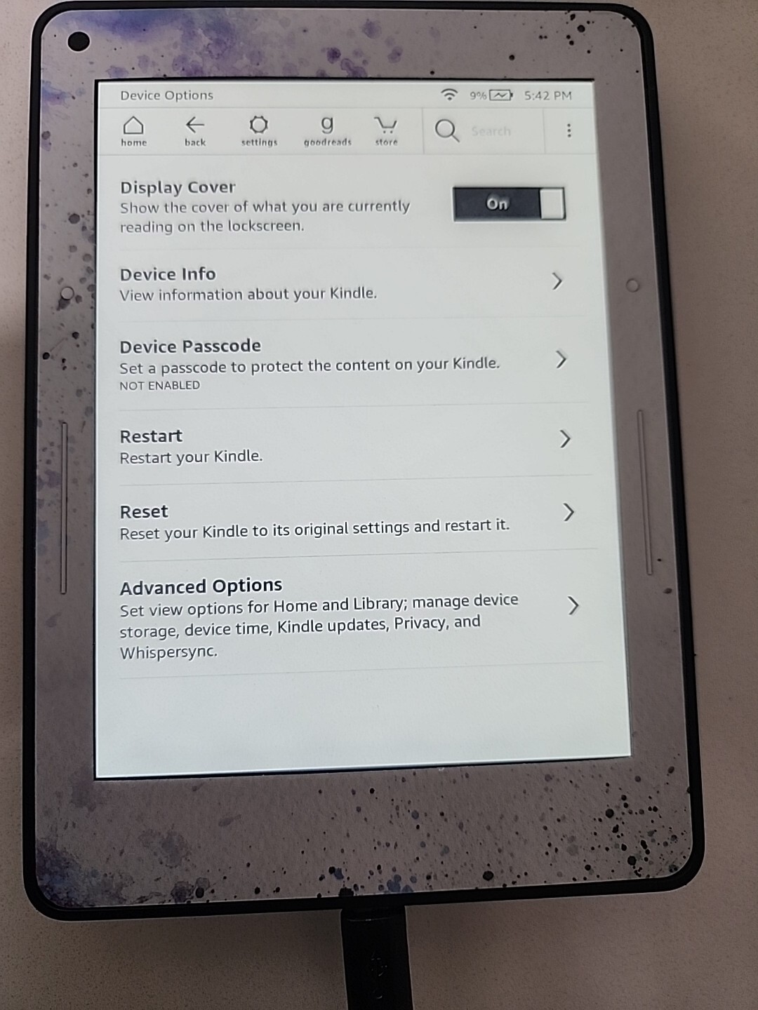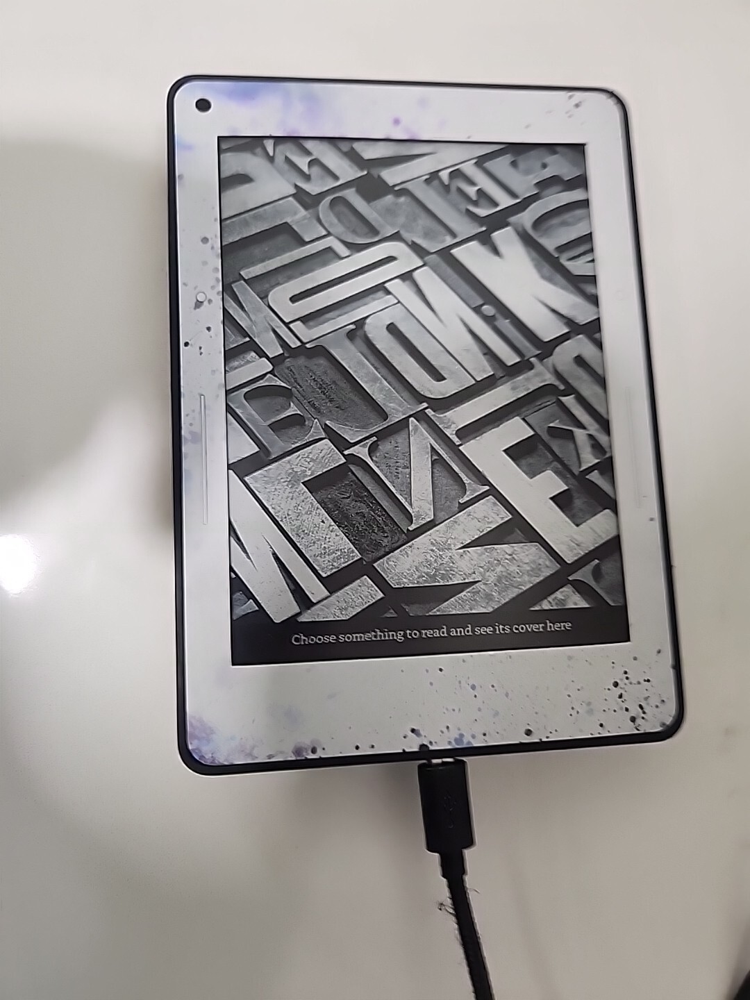 This is a Kindle Voyage. A charger is not included. I purchased this Kindle voyage a year ago used for the novelty of the device. I have since attached a blue form fitting sticker with a wolf picture on the back. The sticker is designed for the Kindle voyage and in no way inhibits the use of the page turn buttons or the light sensor. The battery is in a decent state considering the age. Standby is still about a month. Frequent heavy use would likely require charging every 1-2 weeks. The device has an off brand pop socket attached. This is removable but may damage the sticker. There is minor damage to the top right corner, general scuffing along the border. On the screen in the top mid left is a slight discoloration that was present when I received the device. I have tried to include 2 pictures to demonstrate. When the device is on this is not really noticeable. It is only when light reflects that it is visible.