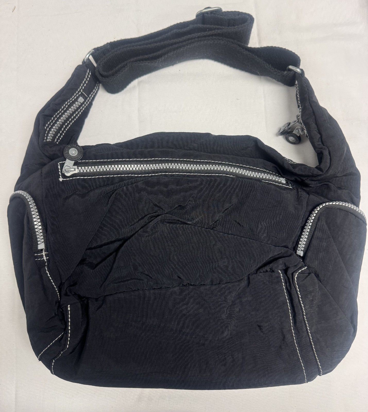 The Kipling Charcoal Convertible Crossbody Shoulder Bag is a versatile and stylish handbag in size Large, perfect for travel, casual outings, and workwear. The rectangular shape with a zip closure and black crossbody strap adds a fashionable touch to the bag. The exterior in black nylon and silver hardware accents make it a trendy option for everyday use. The bag also features outer and inner pockets, is lightweight, water-resistant, and comes with a bag charm as an accessory. Perfect for the modern woman on the go, this Kipling bag is a comfortable and practical choice for any outfit.