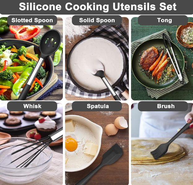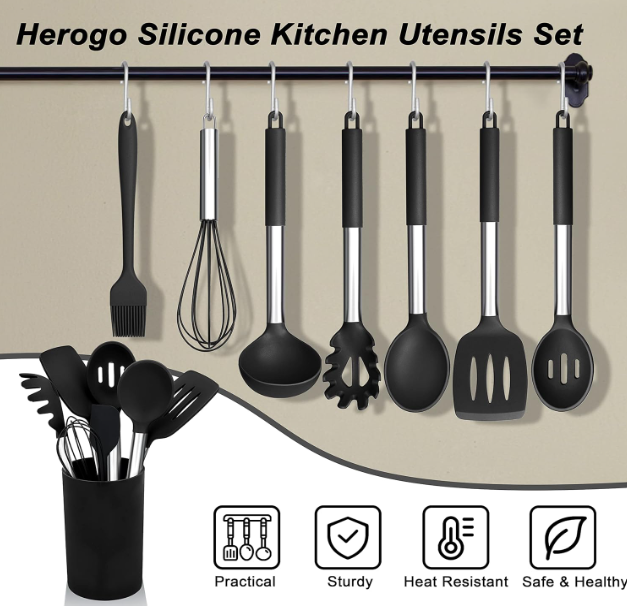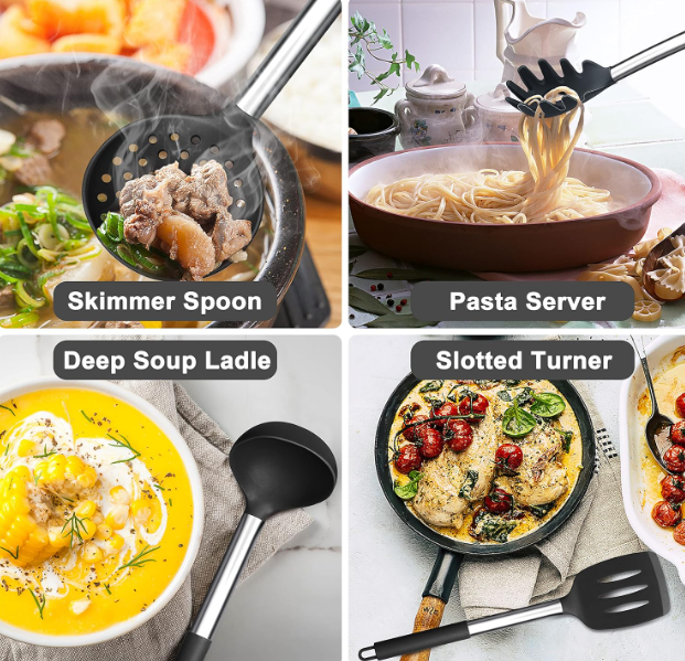 PRACTICAL UTENSILS SET 12-piece professional kitchen utensils set includes skimmer spoon, slotted turner, deep soup ladle, pasta server, salad turner, slotted spoon, solid spoon, spatula, whisk, tong, brush and holder, A practical cooking utensils set meet all kinds of your daily kitchen needs FOOD GRADE MATERIAL Made of food grade silicone ensure non-toxic and healthy cooking, No worry about any harmful substance into food, Sturdy and soft silicone utensil head will not scratch your non-stick cookware and extend the life span for your favorite kitchen cookware pans HEAT RESISTANT & DURABLE Silicone kitchen utensil enable to withstand high temperatures up to 446°F/230°C which allows to mix or use directly into the pans, Heat-proof handle can insulate from heat and protect your hand when you cooking, High quality silicone utensils is stain resistant and won’t melt or rust, durable for long-time use ERGONOMIC HANDLE & NON-STICK All the cooking utensil are firmly connected with stainless steel handle which enhance durability and rustproof, Ergonomic design which is provide a great grip for you and hold comfortably, Non-stick silicone are easy to clean, for better maintenance, please use towel dry immediately and store in a dry place after cleaning Shipping Policy · We ship to your e bay or pay pal address. · Item will be shipped within 1-2 business days when we receive payment · Delivery time depends on destination and other factors. · Item tracking information will be updated on the e bay system and you can view the tracking from your purchase history. · Tracking information Will be available after 1-2 days from shipment. Contact us · Your Positive feedback is extremely valuable to us. · If you have any concerns about your order please contact us through e bay massage to resolve any issues before leaving negative feedback or opening a dispute. · We will reply within two business days. · We wish you pleasant shopping and happy life. Thank you so much for visiting our store and come again.