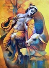 Krishna and Holy Cow | Handmade Painting | Cotton Canvas | Acrylic Color