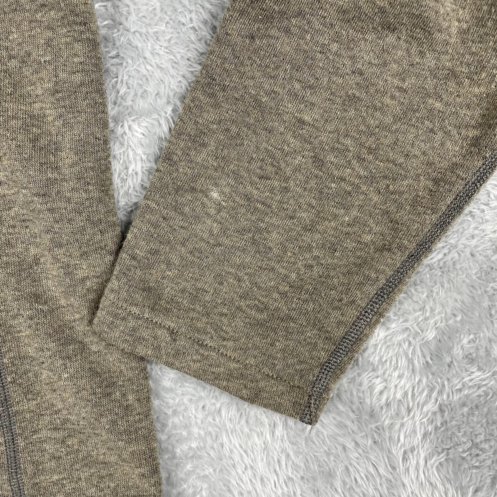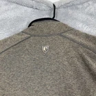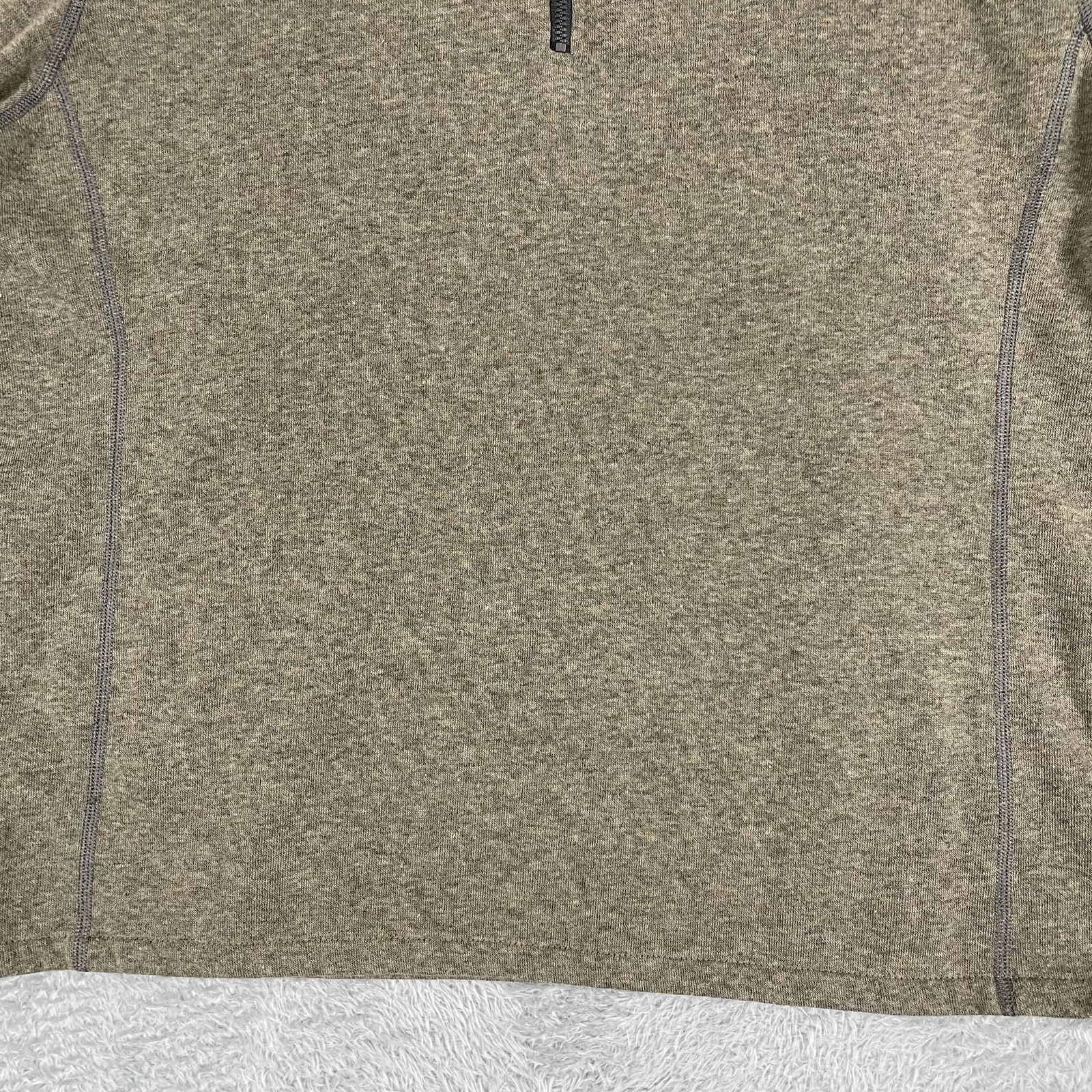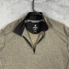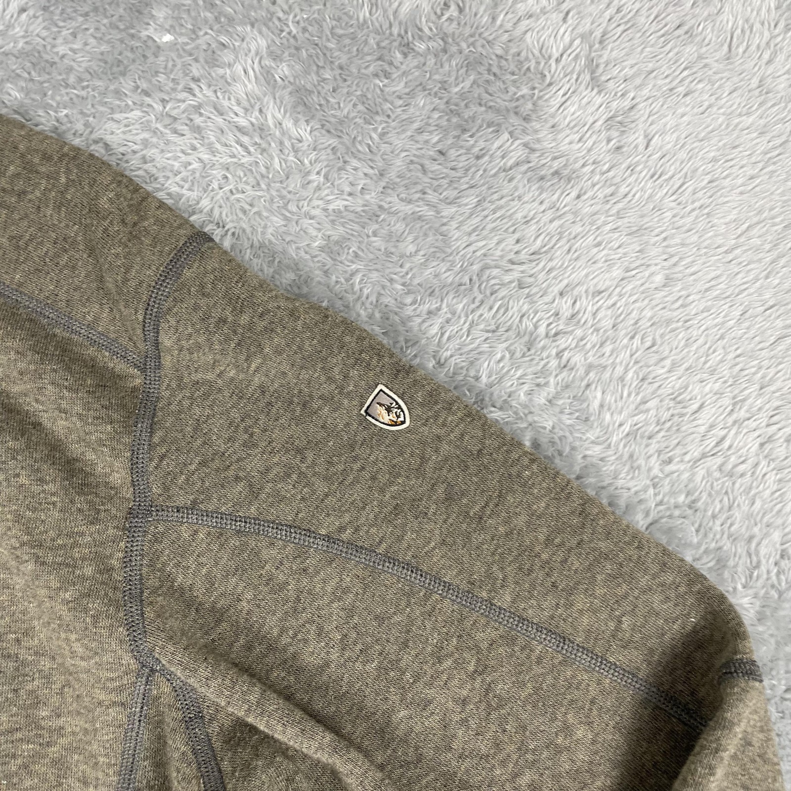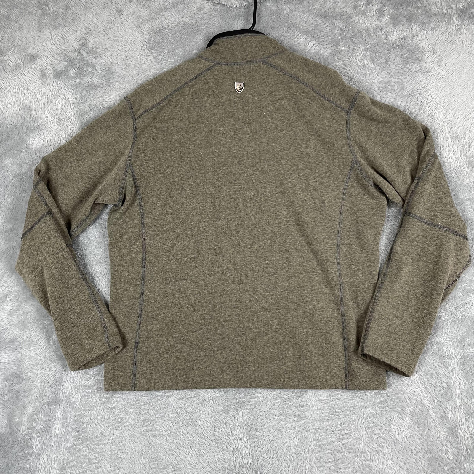 Brand: Kühl Style: Mens long sleeve quarter zip pullover with mock neck and thermal fleece-like interior, ideal as a midlayer for hiking or cold weather wear. Color: Heathered brown with darker contrast flatlock stitching and black trim at the collar and zipper. Size on tag: XL Material: 52% acrylic, 30% polyester, 18% rayon (viscose blend) per interior print. Design details: Soft brushed interior for warmth, raglan sleeves for ease of movement, front quarter length zipper with pull, straight hem, and no pockets for a streamlined fit. Branding and labels: Kühl mountain shield logo patch at upper left sleeve and back neck, interior printed neck label with "KÜHL Born in the Mountains XL Kashmira," and RN# 108846. Country of origin: Made in El Salvador. Care: Machine wash cold on delicate cycle, no bleach, hang dry (per interior care tag).