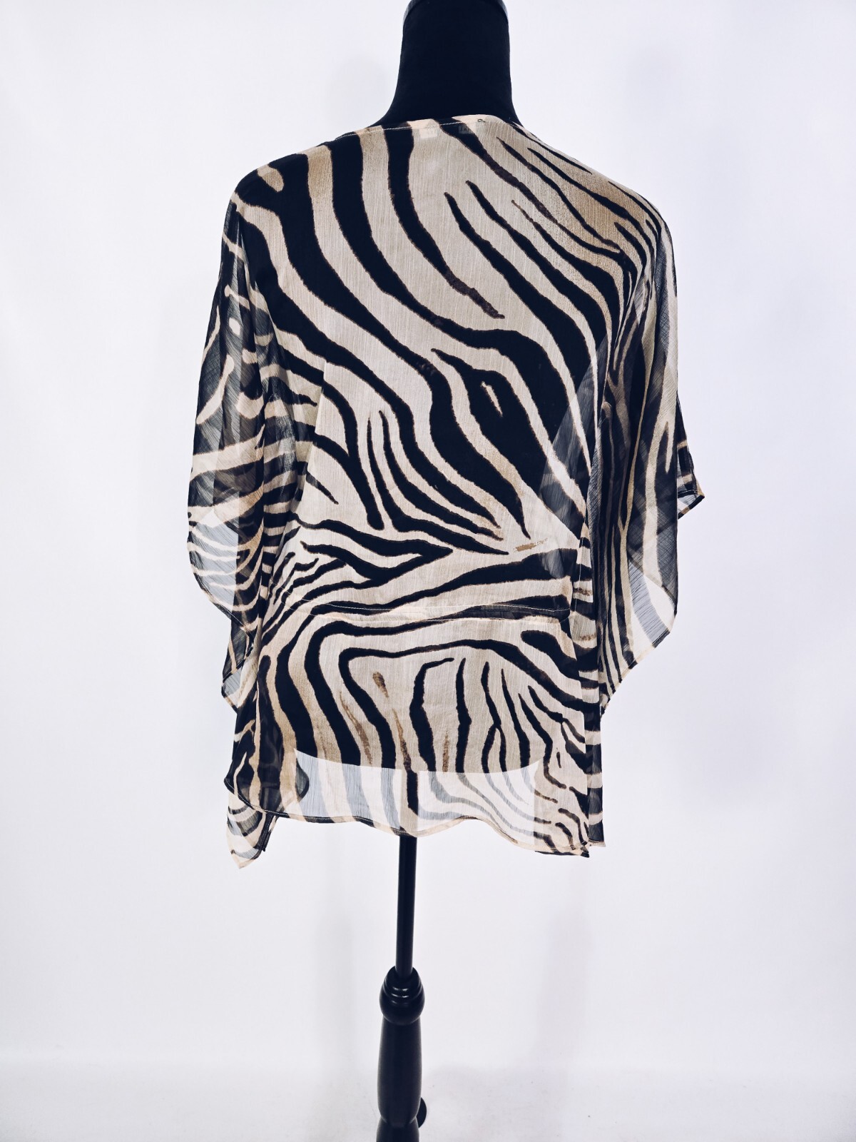 Lauren Ralph Lauren zebra print sheer v-neck poncho style tunic top with drawstring waist. Size petite small. shoulder to hem: 26.5". 100% polyester. In excellent pre-owned condition.