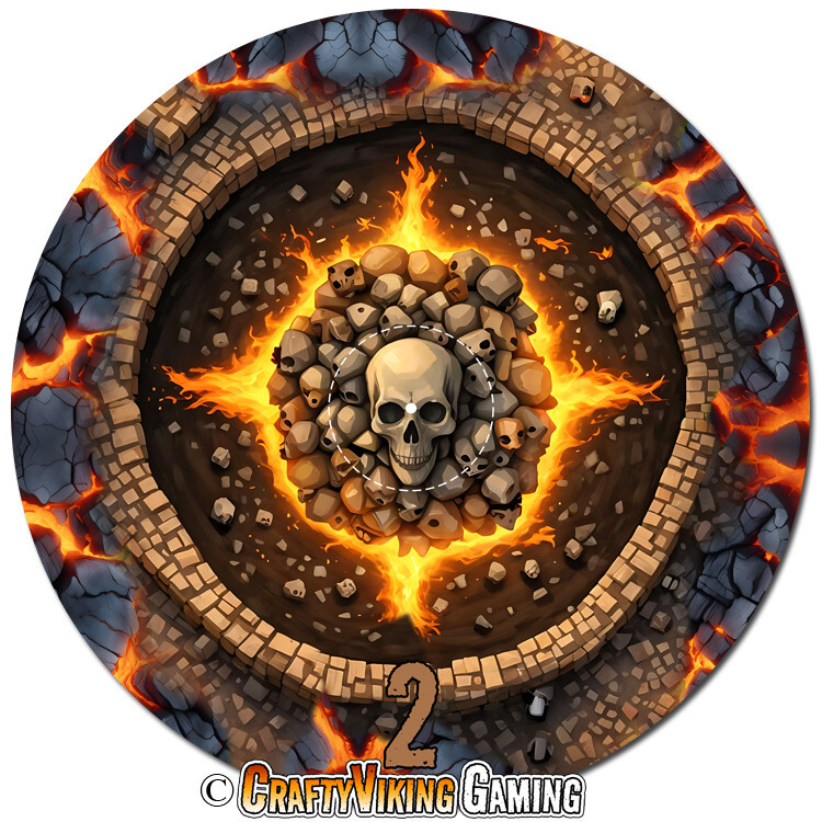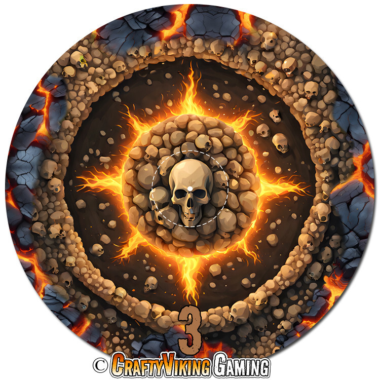 Lava Rock Set of 6 objective markers for Warhammer 40K / Age of Sigmar 4th Ed. This set features a volcanic lava rock terrain with a rock wall, skull piles, fire & brimestone. Numbered 1-6 40 mm (marked center circle) for simple measuring plus 3 inches to the edge Total diameter 192 mm or 7.57 inches 2 mm thin neoprene (mouse-pad) material Non-slip rubber backing Enhance your gaming experience with these high quality attractive objective markers. No more guessing if a model is in range. Thanks for shopping & happy gaming!
