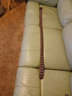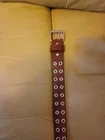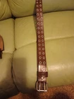 Step up your style game with this leather work belt, featuring multiple brass grummets for an adjustable fit, and a brass buckle. The colorful theme of this belt will add a pop of excitement to any outfit. Whether you're dressing up or down, this unisex belt is the perfect accessory for any occasion. Made with high-quality leather, it's built to last and will quickly become a staple in your wardrobe. Get ready to make a statement with this unique and stylish belt. IT IS 54 " LONG X 1.5 " WIDE