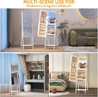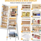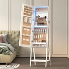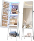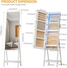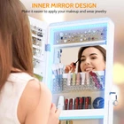 [3-in-1 Jewelry Cabinet] Enjoying the triple benefits of a jewelry organizer, full-length mirror, and vanity mirror will give you a lot of fun dressing up. HD full-length mirror jewelry cabinet offers you a head-to-toe view of your outfit in real image and you can store all jewelry in order with this jewelry organizer stand [Large Storage Space] 72 earring slots, 39 ring slots, makeup brush & lipstick acrylic storage box, 24 necklace hooks, 3 storage shelves, 2 acrylic drawers, 2 PVC storage bags, 1 storage fabric bag, 1 bottom shelf. The mirror jewelry cabinet standing provides plenty of storage space and keeps all your jewelry well organized. Meanwhile, the velvet liner will prevent your jewelry from being scuffed and scratched [Bulit-in Mirror with Lights] Inner LED lights mirror that has 3 colors of light (Blue/White/Warm) —you can use the touch button to find the perfect lighting makeup mirror convenient for make-up/jewelry fitting/skin care. In addition, the mirror frame is designed with rounded corners acrylic LED lights to add a stylish, trendy atmosphere to your home [Lockable Design & Easy to Assenble] Ensure the perfect condition of every makeup and jewelry piece, as this mirror jewelry cabinet comes with a lock and 2 keys to keep children out and prevent unwanted openings. Moreover, the cabinet body is pre-assembled, so you only need to assemble the legs and attach the bottom shelf by following detailed instructions [Quality Material & Fancy Gift] Made of high-quality wood material, each panel is carefully selected. The triangular structure can also make the mirror jewelry cabinet more stable. Give this reliable jewelry armoire with storage to your special someone and watch as they pretty smile, or treat yourself to creating a beautiful space that will make you shine every moment Product Description 1 LIVING ROOM 2 BEDROOM 3 CLOAKROOM LVSOMT LED Mirror Jewelry Cabinet This LVSOMT Standing Jewelry Mirror Cabinet not only comes with 3-color lighting and a makeup mirror inside, but also has great jewelry storage space . Every detail is thoughtfully designed to make it easy for women to dress up / skincare, making it ideal for any space! The video showcases the product in use. The video guides you through product setup. The video compares multiple products. The video shows the product being unpacked. Experience Optimal Lighting For Grooming Or Makeup Application Crystal Acrylic Storage Shelf / Tray / Drawers Large Capacity Jewelry Organizer Armoire Can meet your needs to place a variety of skin care products, cosmetics, and perfumes No need to worry about the inability to visit the packaging bottle The battery box (6AA) is cleverly hidden by the removable shelf, making the appearance more beautiful and neat