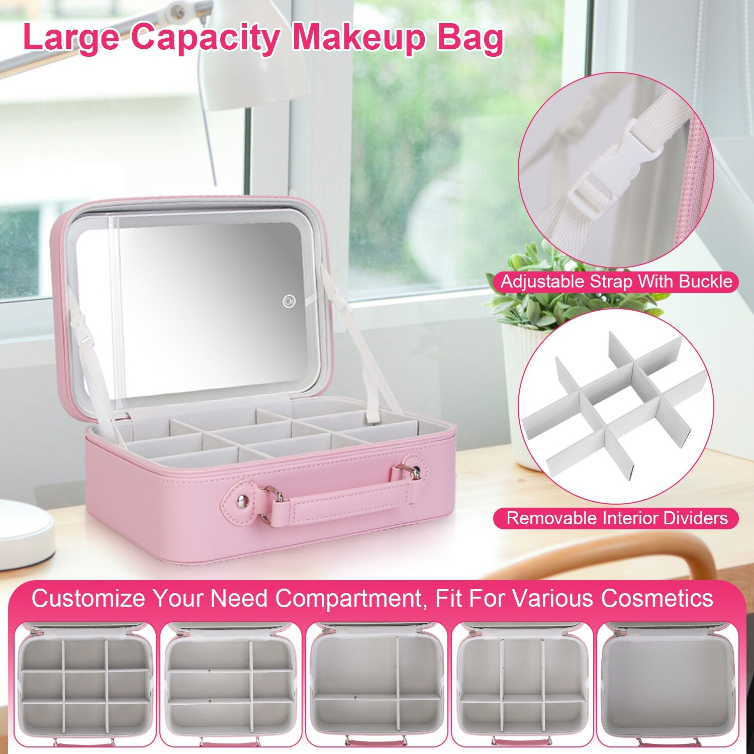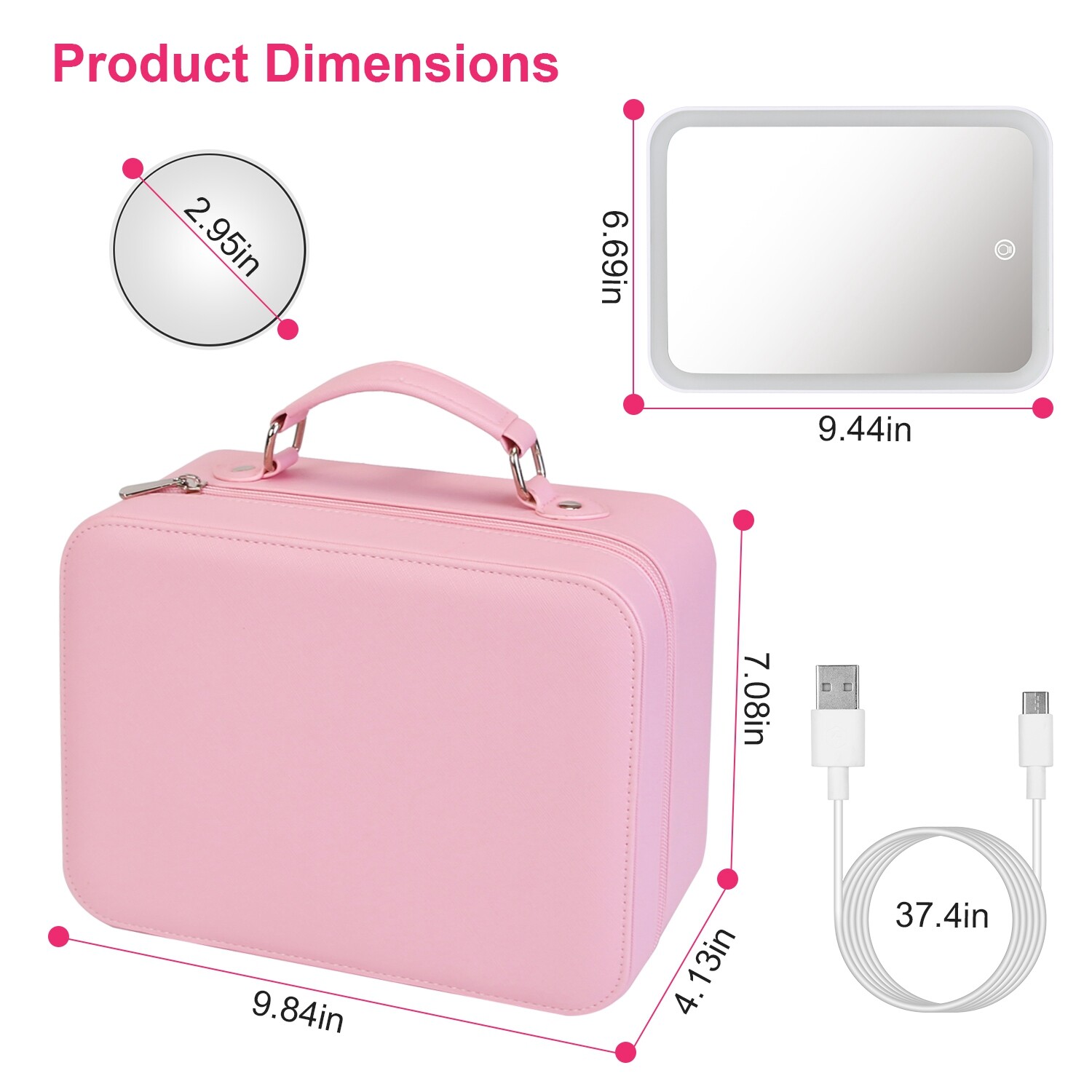 Makeup Bag Dimmable Brightness LED Mirror Featured Item Product Detail Image Gallery Product Description Overview: With its flexibly removable dividers, this travel makeup bag with mirror is the perfect companion for all your cosmetic needs while on the . The LED mirror offers 3 lighting colors and dimmable brightness, allowing you to adjust it according to various lighting conditions. Moreover, the foldable and rotatable stand helps you to find the best angle. 10X magnifying mirror can be detached, giving you the convenience of observing every detail of your makeup and making timely adjustments. Made of sturdy, enduring, waterproof PU leather, this elegant portable cosmetic bag is a perfect gift for your wife, girlfriend and mother in special day! Features: Portable Makeup Bag With Mirrors: Our large capacity travel makeup bag is designed with total of 9 compartments,each measuring 2.95x2.16in,provides well protection for your different cosmetics,like lipsticks,liquid foundation,cushion foundation,preventing them from broken and dripping. Or you can take out the interior dividers to store makeup brushes and larger cosmetics. Package also includes 1* LED mirror and 1* magnifying mirror,this all-in-one portable cosmetic case ensures that your beauty remains intact even during traveling. 3 Light Colors & Dimmable Brightness: The LED cosmetic mirror comes with 3 light colors:cold white,warm white,warm yellow,and 10%- dimmable brightness,imitate different indoor light and natural light conditions,reflecting the most realistic skin condition and facial details in your face. After fully charged,this rechargeable LED mirror ensures about 130minutes continuous illumination,long enough for you to finish a perfect makeup,whether it is party makeup,commuting makeup,or daily makeup. Flexible LED & Magnifying Mirror: 90° Foldable and 360° rotatable flexible stand behind the LED mirror makes this mirror can be vertically or horizontally placed on the table,ensure every angle of your makeup is covered and glorious. Additionally,the 10X magnifying mirror attached to the LED mirror glass can be detached,which is convenient for you to observe every detail of your makeup so that you can make timely adjustment. Premium PU Leather Material: Crafted from premium textured PU leather,this elegant and delicate makeup bag is sturdy,enduring,waterproof and tear-resistant. Built-in zipper ensure smooth use of this travel makeup bag and reinforced handle with metal connection can withstand heavy weight capacity. Perfect Gift For Women: Color option in pink and blue,this exquisite portable travel makeup bag with LED mirror and magnifying mirror is the perfect gift for your girlfriend,wife and mother in Valentine’s Day,Mother’s Day,Thanks Giving Day,Christmas,birthday,and anniversary! Friendly Reminder: 1. Keep away from sharp objects to avoid damaging the PU leather. 2. Avoid exposure to direct sunlight for prolonged periods to maintain the color and quality of the bag. Specifications: Brand: Laromni Product Type: Travel Makeup Bag With LED Mirror Makeup Bag Material: PU Leather; Cotton; Metal Mirror Material: Glass; ABS Color Option: Pink, Blue LED Mirror Power Supply: 800mAh Rechargeable Battery Charged Time: About 200Min Usage Time: 130Min LED Mirror Stand: 90° Foldable; 360° Rotatable LED Light Color: Cold White; Warm White; Warm Yellow Light Brightness: 10%- Dimmable Each Compartment Size: 7.5x5.5cm/2.95x2.16in LED Mirror Size: 24x17x1.5cm/9.44x6.69x0.59in LED Mirror Weight: 384g/0.84lbs Magnifying Mirror Diameter: 7.5cm/2.95in Magnifying Mirror Weight: 37g/0.08lbs Type-C Charging Cable Length: About 95cm/37.4in Item Size(Include Mirror): 25x18x10.5cm/9.84x7.08x4.13in Item Weight(Include Mirror): 1056g/2.32lbs Package Size: 26x20x12cm/10.23x7.87x4.72in Package Weight: 1210g/2.67 lbs Package Contents: 1x Makeup Bag 1x LED Mirror 1x Magnifying Mirror 1x Type-C Charging Cable 1x User Manual Terms & Conditions Thank you for your business !