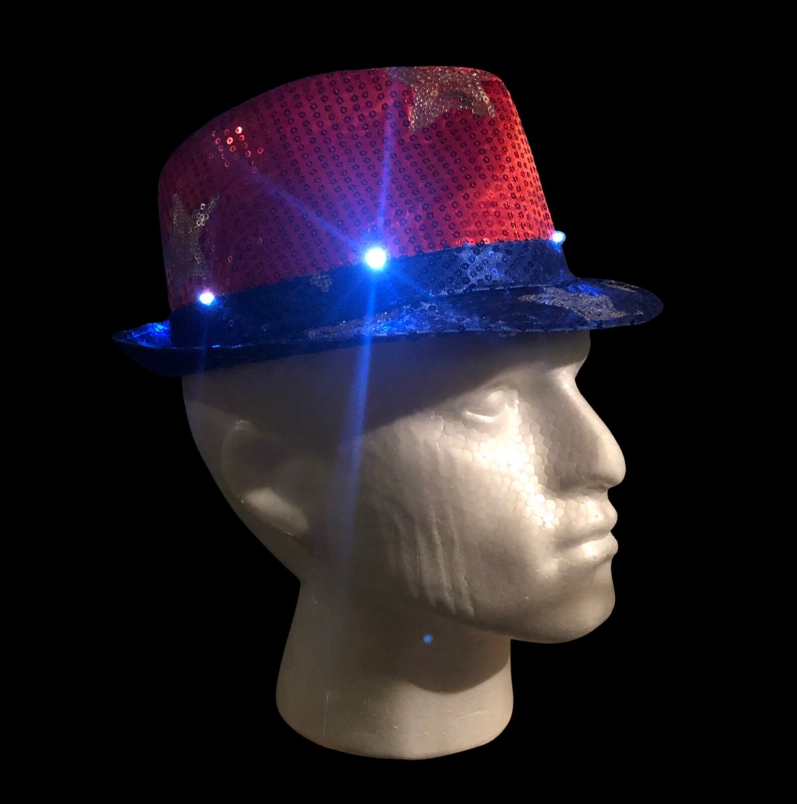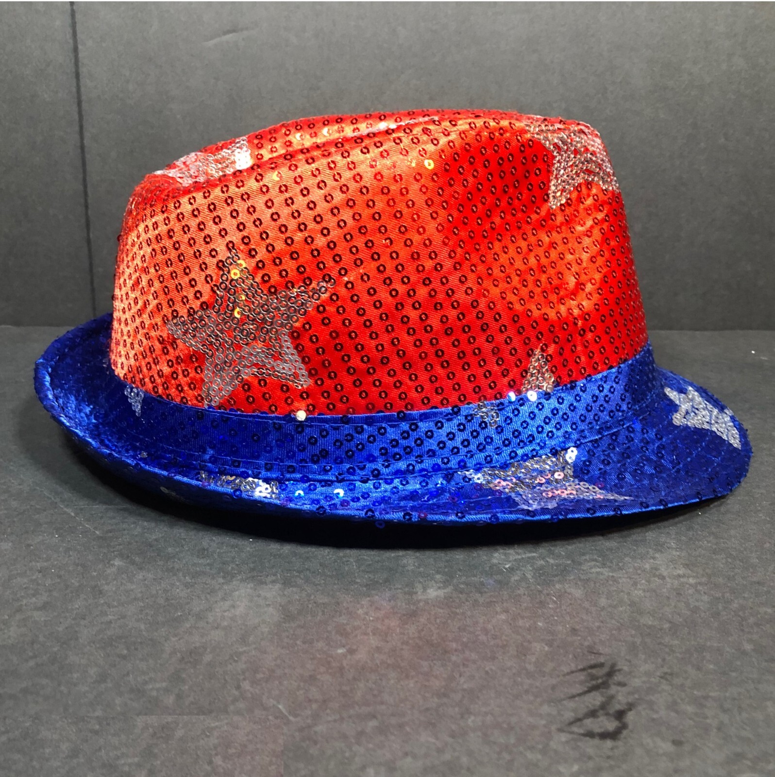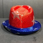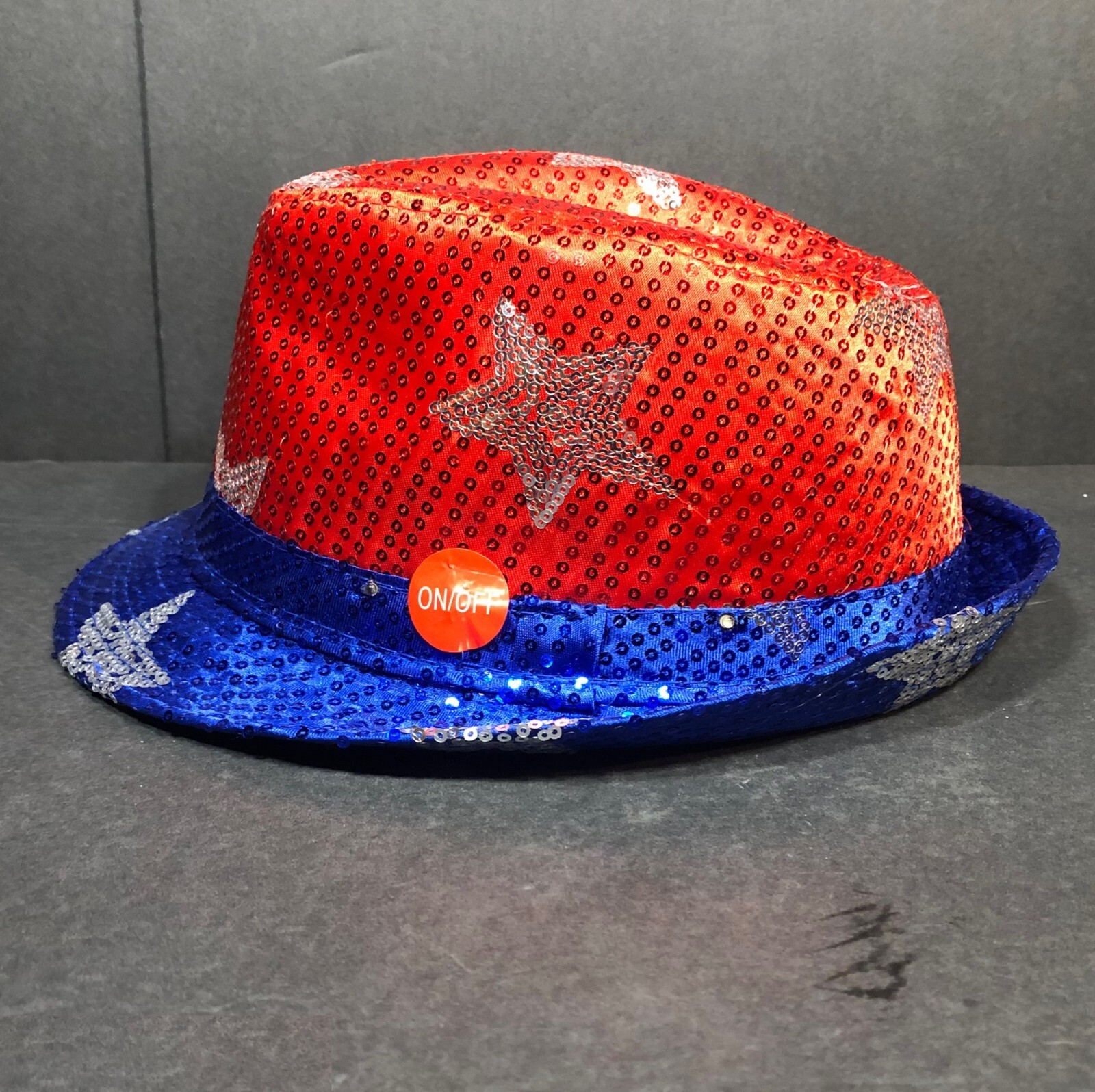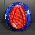 Novelty Fedora Hat Red, Blue, Silver Stars with Blinking LED Lights 3 Replaceable Batteries (Included) Off/Off Switch on Side 100% Polyester Condition Description: New with Defects - No Tags See ALL Photos Ships Via: USPS Ground Advantage Ships In: 7" x 11" x 13" Package 1 Lb 10 oz Ships From: the State of MS USA Shipping Weight shown in Listing includes Protective Packaging If you like this item, I have Similar Available! Visit my STORE by clicking the link provided in this ad, go to SELLER INFORMATION go to CATEGORY list see: HATS / CAPS I do have Offers Activated so feel free to Make an Offer!