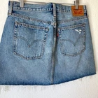 Distressed denim skirt. Great medium blue. Button fly. 100% cotton. Labeled Size 30" Waist 16.5 inches Length 15 inches