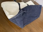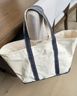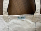 Vintage L.L.Bean Boat and Tote canvas bag made in USA. Classic natural canvas with navy blue trim and handles. This is a well-loved vintage tote with signs of use that give it great character. Heavy-duty canvas construction and still very usable for everyday carry, beach, travel, or shopping. Details: • Brand: L.L.Bean • Model: Boat and Tote • Made in USA • Color: Natural canvas with navy trim • Open top • Heavy canvas construction Condition: Preowned vintage condition. Shows wear consistent with age and use including interior marks, light staining, fraying on edge, and a small hole on the bottom corner (see photos). Structurally sound and plenty of life remaining. Please review all photos as part of the description.