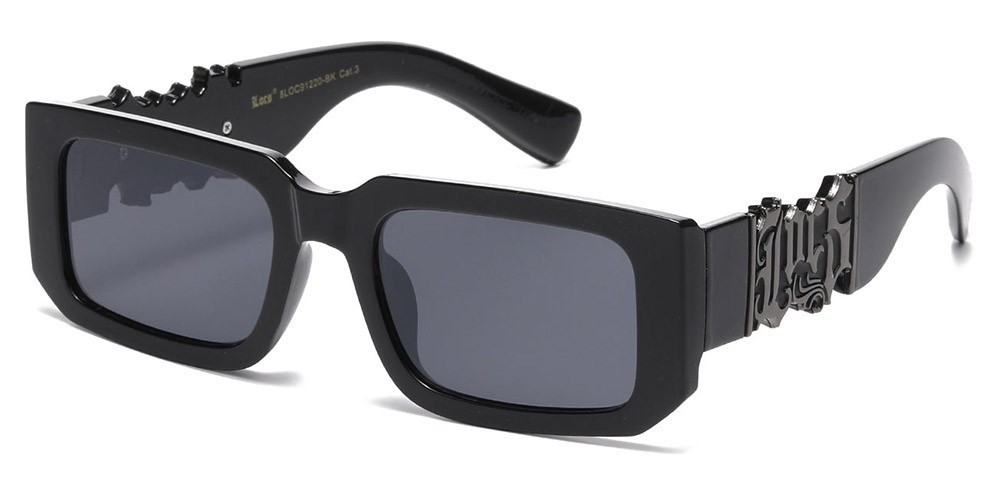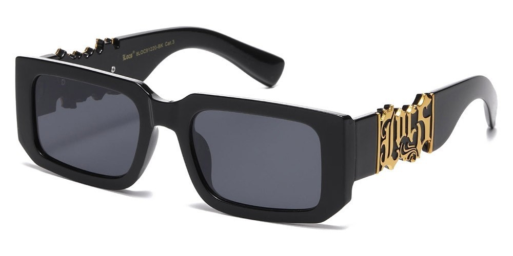 These sunglasses from LOCS Hardcore Shades offer UV400 protection, black plastic frames with big LOCS logo in gun metal and gold colors and dark polycarbonate rectangle lenses. Great for any kind of outdoor and sport activities. Free shipping in the United States.