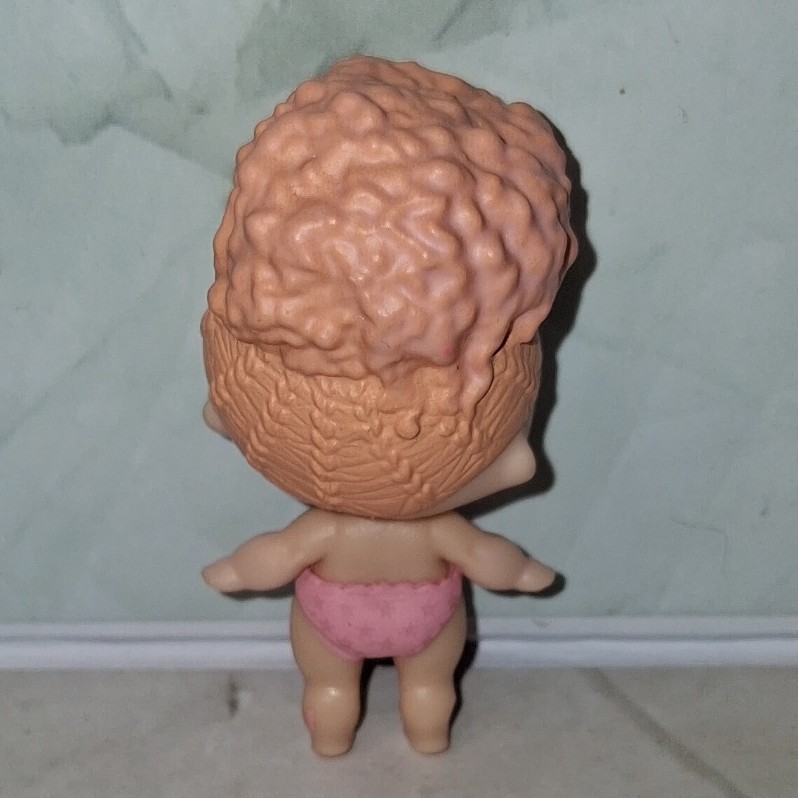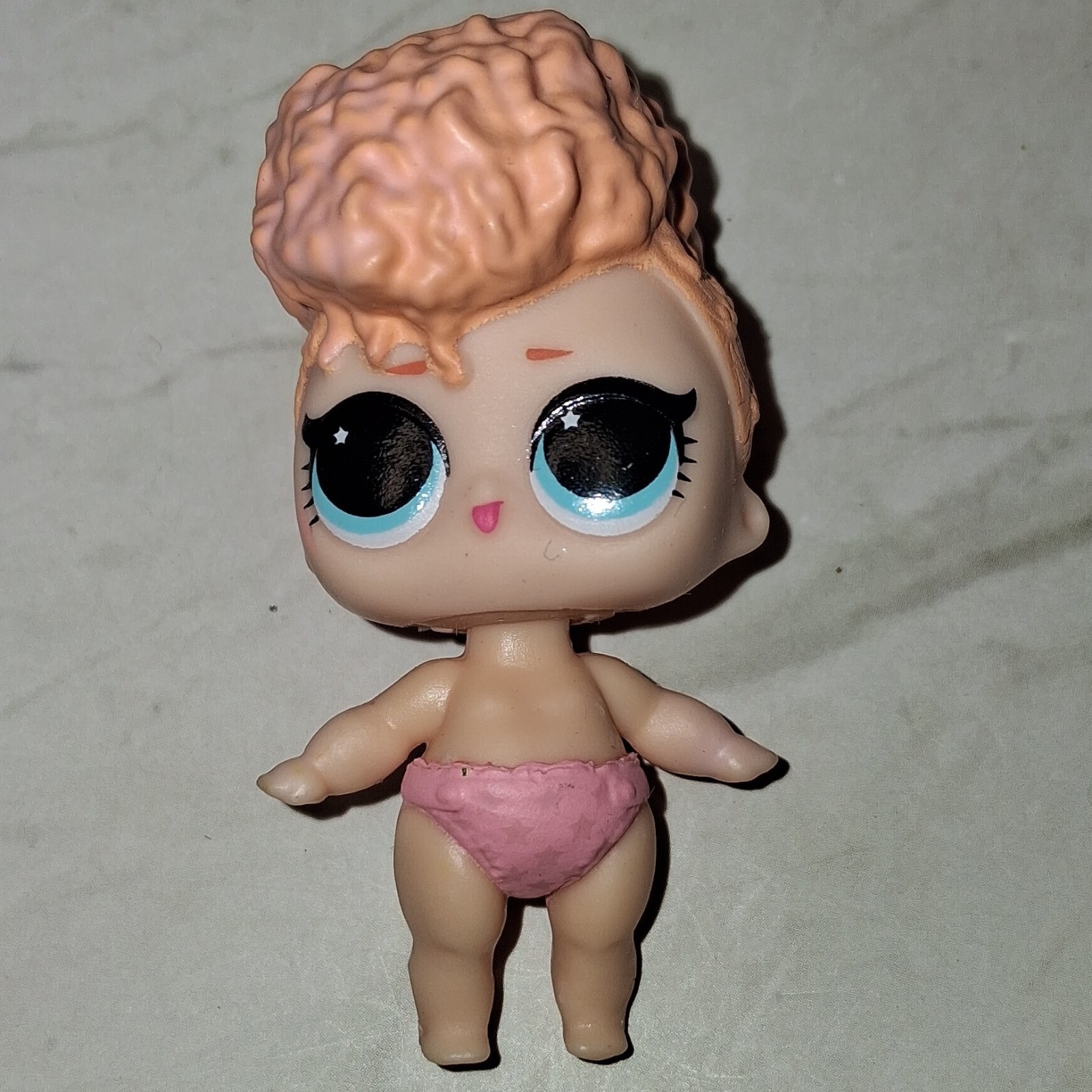 The LOL Surprise Baby Doll Lil Goodie from Lil Outrageous Little Collection Orange Hair and Pink Shorts is a miniature 2" tall doll made of plastic. Part of the L.O.L. Surprise! franchise, this baby doll features wavy orange hair, black eyes, and a light complexion.