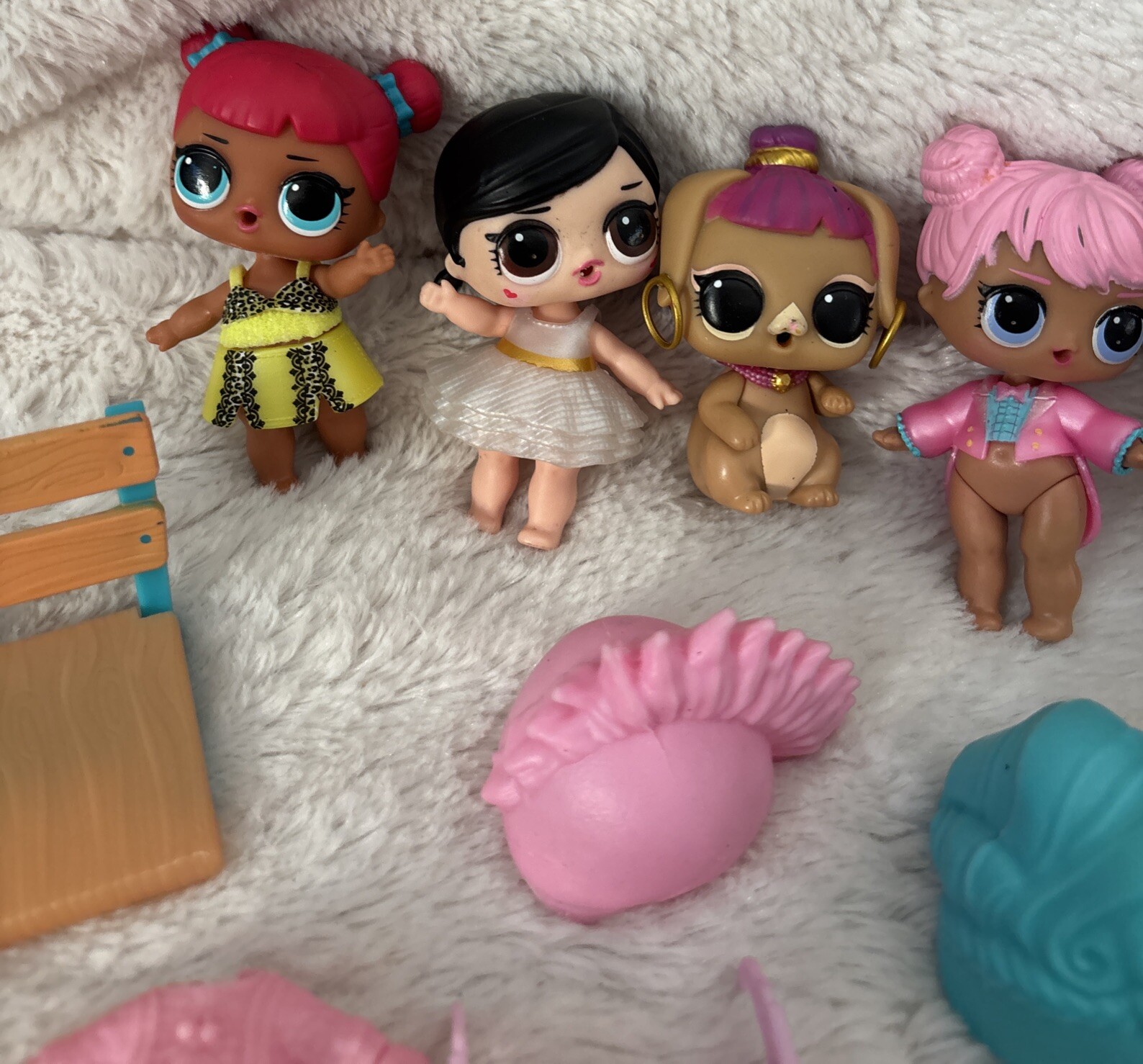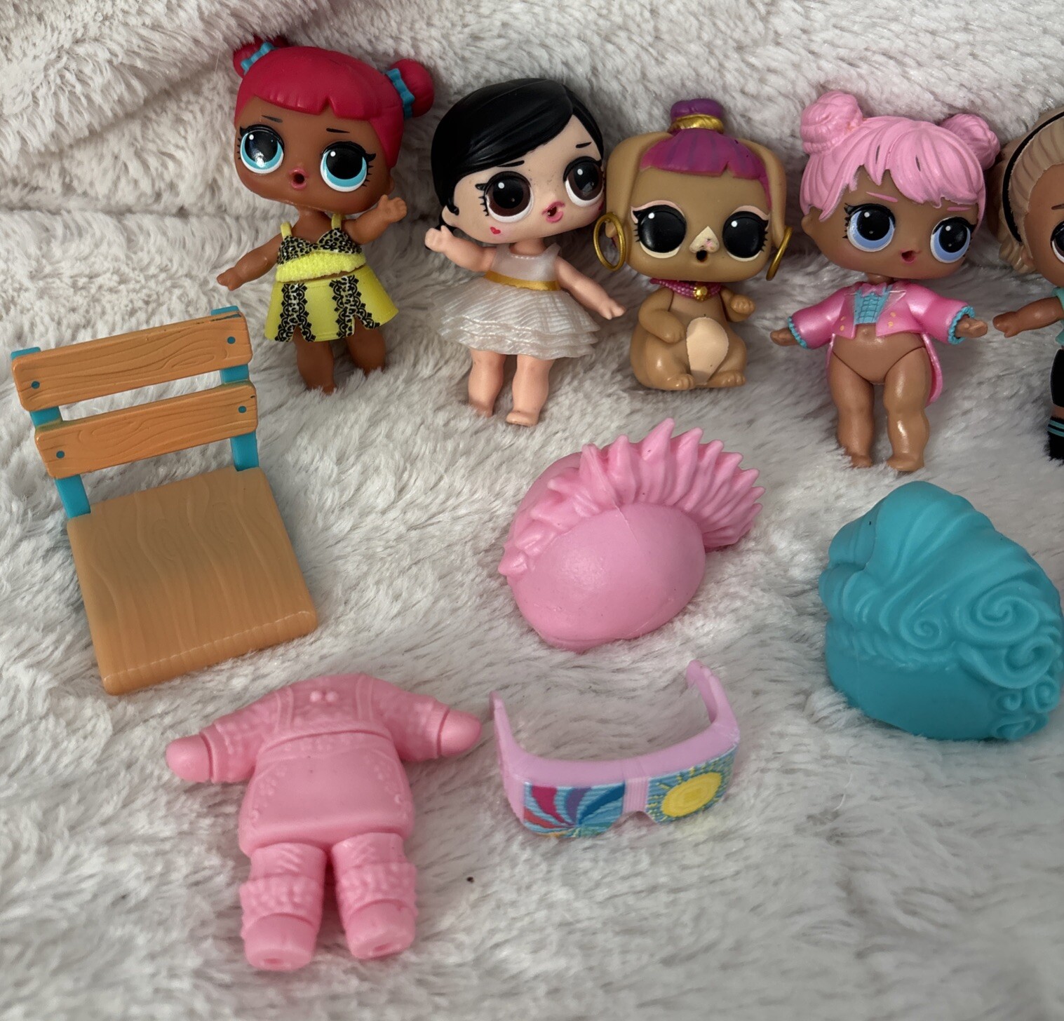 This LOL Surprise dolls lot includes 6 dolls, 1 pet, and various accessories. The dolls come in different sizes and have varying hair colors, hair types, eye colors, and complexion. This set is perfect for all occasions and is an original L.O.L Surprise franchise. The dolls are 3 inches in size and are sold as a lot. There are outfits on most plus extra items see photos