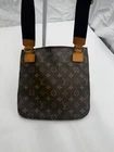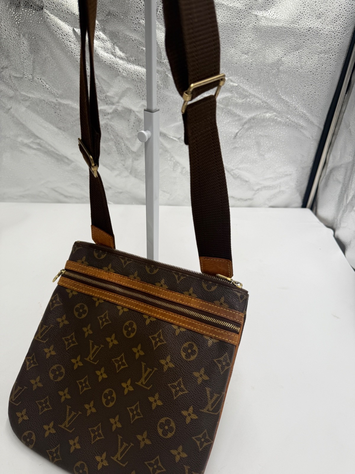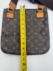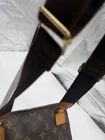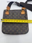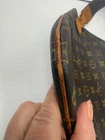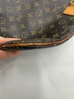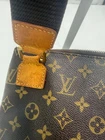 The Louis Vuitton Monogram Pochette Bosphore Shoulder Bag is a medium-sized vintage shoulder bag featuring no a classic Louis Vuitton Monogram pattern. Made of brown leather with beige handles, this bag has a zip closure and a luxurious brown leather lining. The Pochette Bosphore model by Louis Vuitton has a front zipper pouch in addition to the large zipped area with classic brown cloth lining. The cloth strap can be worn as a shoulder strap or cross body. This is a vintage bag so does show some wear on the straps with some drying and cracking. Slight storage smell. All piping intact. No cracking of the canvas.