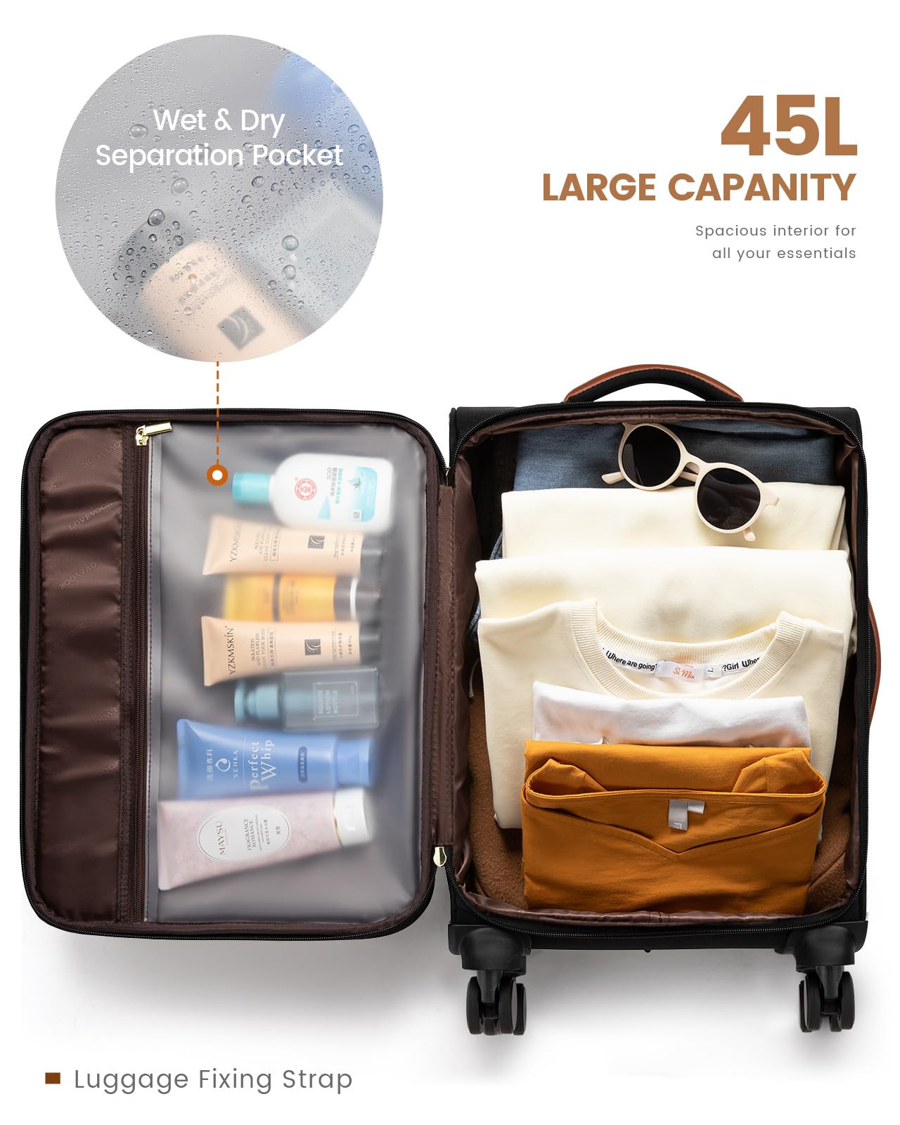 【Streamline Your Travel Experience】 The LOVEVOOK 20 inch carry on luggage is designed for easy access and organization. Featuring three front compartments for quick storage of essentials like boarding passes, magazines, and a dedicated laptop compartment. Top and side carry handles offer multiple carrying options, making travel more convenient and flexible. 【Spacious & Organized】The interior includes a dedicated waterproof wet bag for wet clothes or toiletries. With a large main compartment, straps for easy organization, and multiple pockets, you can pack and find everything you need for your journey. 【Airline Approved Dimensions】 Measuring 21.25 x 9 x 13.78 inches(Includes wheels), weighing 6.7 pounds, and offering a 45L capacity, this carry on fits perfectly in the overhead bin of most major airlines, including American, Delta, United, Southwest, Hawaiian, and Alaska. Travel worry-free knowing your luggage meets airline size requirements. 【Unmatched Durability & Smooth Mobility】 Crafted from premium water-resistant and scratch-resistant polyester with easy-to-clean leather accents, this soft carry on luggage withstands travel rigors. The 360° spinner wheels ensure smooth gliding, even when fully packed, while the three-height adjustable handle minimizes wobble for easy mobility. 【Keep Your Belongings Safe】 Equipped with a TSA-approved lock, this luggage provides peace of mind that your belongings are secure. Durable construction and high-quality materials ensure longevity. 【Superior Customer Support for Peace of Mind】 LOVEVOOK is dedicated to excellent customer service. Each piece of our luggage undergoes rigorous testing to meet strict standards. If you encounter any issues, our customer service team is ready to provide timely solutions.