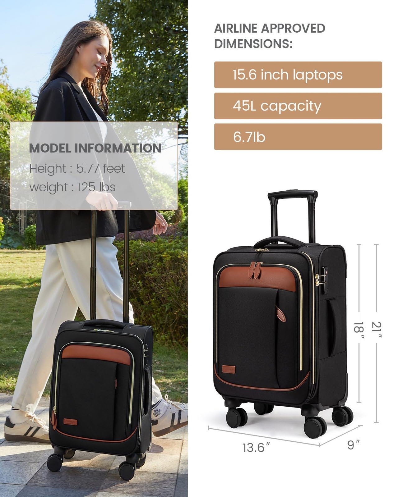 LOVEVOOK Carry on Luggage for Women and Men, Softside Suitcases with Daul Wheels Product Details Color: Light Brown-Black Size: 20-Inch 4 pcs Brand: LOVEVOOK MPN: Does not apply UPC: Does not apply EAN: Does not apply Product Dimensions: 13.6 x 9 x 21 inches Item Weight: 7.5 pounds Department: Unisex Adult Manufacturer: LOVEVOOK Country of Origin: China Capacity: 45 Liters Item Weight: 7.5 Pounds Capacity Total: 45 Liters Quick Access and Effortless Organization: The front pocket is perfect for holding your under 15.6"laptop, allowing for quick and easy access , saving you time and effort. A side pocket holds a water bottle or umbrella. There's a shoe pocket, a zippered mesh pocket, and a cosmetic bag for seamless organization Airline-Friendly and Large Capacity: Overall dimensions: 21"x13.6"x9"; Interior dimensions: 18"x13.6"x9", With a substantial 45-liter capacity, meeting the carry-on luggage size requirements of most airlines,it's ideally suited for 3 to 5 days of travel High-Performance Handle: We've carefully designed the handle with three adjustable height settings for a variety of uses, both refined and convenient. And our luggage's telescopic handle is made of high-quality aluminum and has been tested over 4,000 times to ensure its stability, ensuring smooth, easy control when you move Strong and Secure: This wheeled suitcase is an ideal choice for your travels, adding confidence and security to safe travel. It is made of high-quality, strong, stain-resistant quilted polyester with sturdy zippers and security lock to ensure your valuables are safe and secure during your trip. All-round protection Smooth movement: Our carry-on luggage features wear-resistant dual-wheels that can easily move through busy terminals, easily navigate through tight corners, and move more smoothly, maintaining perfect stability so you can travel comfortably. Our luggage is extremely mobile, so you can focus on the journey ahead with peace of mind