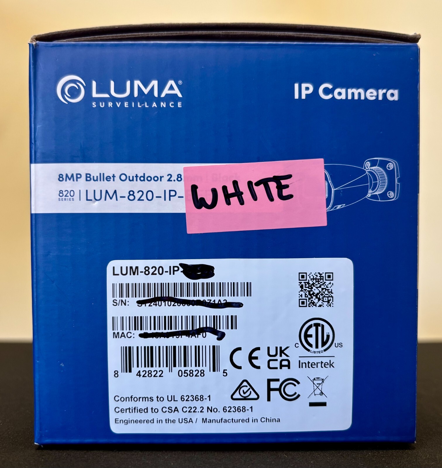 Luma Surveillance™ 820 Series 8MP Bullet IP Outdoor Camera Main Features NDAA compliant 8MP image sensor with 2.8mm fixed lens Up to 3840 x 2160p maximum resolution at 30FPS Quick and easy deployment and management using OvrC View device status and remotely troubleshooting with OvrC AI-enabled intelligent analytrics for person and vehicle detection IR night vision up to 30 meters IP67 outdoor ingress protection against weather and elements Instant push notifications and alerts with Luma View App 3-Year Limited Hardware Warranty Works with Control4 and other automation systems