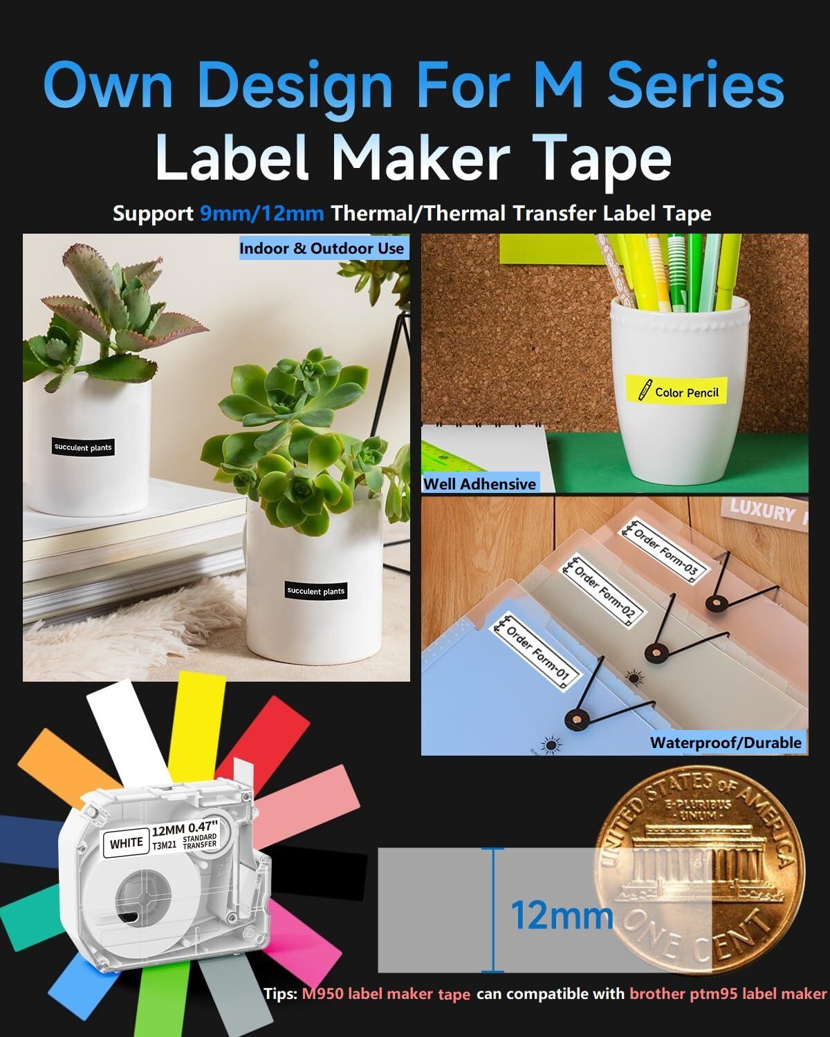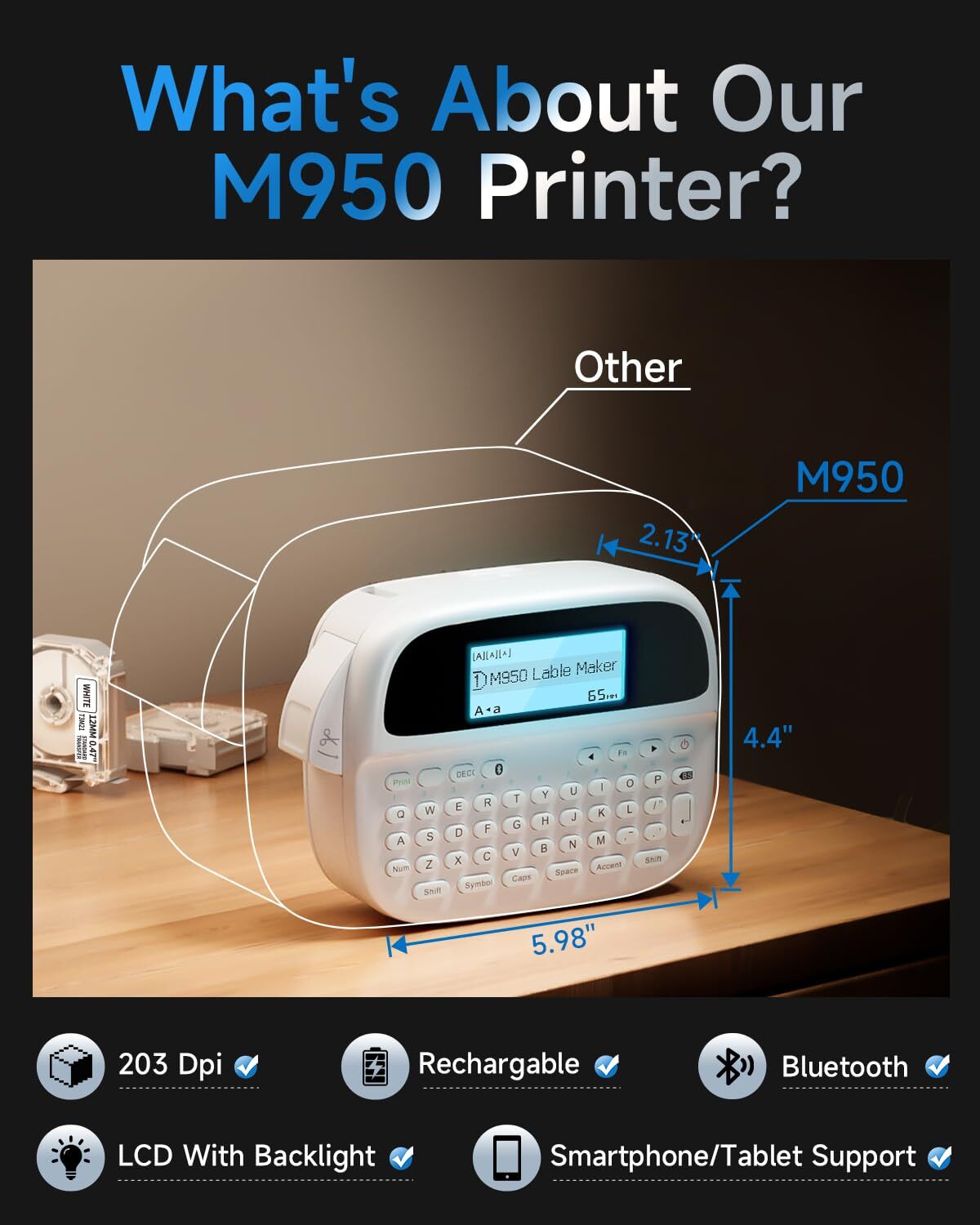 √ Upgrade design: Get ready for a whole new level of convenience and fun! The M950 label maker- a modern twist on traditional key-based machines. Enjoy the convenience of direct keyboard editing and the upgraded printing experience through Bluetooth connectivity with your smartphone or tablet using the Print Master app √ Rechargeable Build-In Battery: No more wasting money on disposable batteries! Our label maker machine comes with a rechargeable lithium battery that can be used over and over again. We even include a roll of label tape and a USB cable in the package. Just plug it into a 5V-2A charging plug and you're good to go √ LCD Backlight Screen: Our handheld labeling device features a large screen with built-in backlight, ensuring excellent visibility even in low-light conditions. It sets a new standard for home and warehouse labeling equipment √ Satisfy your endless labeling need: Whether it's for your home office school organization or professional needs, our rechargeable label printer offers options for 9mm and 12mm label widths. Plus, M950 label tapes expanded our range of label types to suit your individual style and requirements √ Reasonable QWERTY Keyboard: We've also taken care of your comfort. The wider keyboard design ensures your thumbs can easily reach all the keys, making printing a breeze. Get ready to enjoy the thrill of keyboard printing like never before