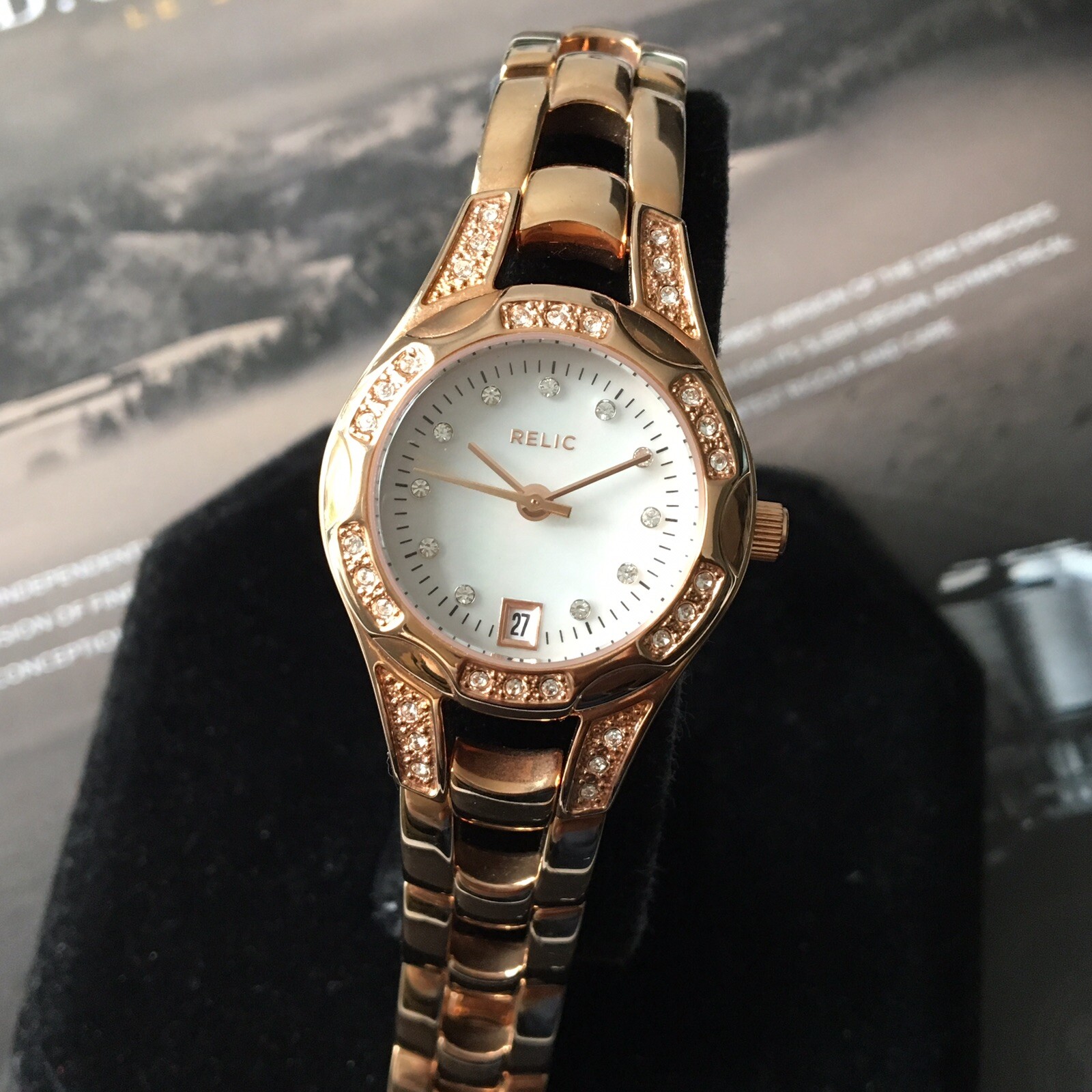 Ladies Relic CHARLOTTE Watch By Fossil Rose Gold Crystals Steel Bracelet Genuine. A superb looking designer fashion watch constructed from rose gold pvd stainless steel. It features an iridescent mother of Pearl dial embellished with sparkling crystals. The item is is in excellent condition, light blemishes to the case and strap. The glass is in perfect condition. The watch is set on it’s original signed bracelet which will fit 6.5 inch wrist. A fresh battery has been installed and is in perfect working order. The case measures approximately 25mm excluding the crown. No original box or papers. Will come in a generic box for safe transit. PLEASE NOTE DUE TO CUSTOMS, DELAYS AND LOST POST I DO NOT SHIP TO SOUTH AMERICA, ISRAEL OR ANY MIDDLE EASTERN COUNTRIES.