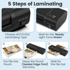2 Mins Warm Up Time: The laminator machine features extra fast 2-minute heat up time and 11-inch per minute faster laminating speed, make your laminating work more efficient. This small laminator machine also comes with 20 pieces of 3 mil laminating sheets (5 for A4 size, 5 for A5 size, 5 for A6 size, 5 for Card Size) for hot lamination, meet your various usage needs Fully Lamination: The patented One-Step Tech can prevent bubble or wrinkle effectively. This thermal machine works efficiently with laminating sheet thicknesses from 3 mil to 5 mil. Also, the laminating machine can accept file up to 9 inches (A4 Size) wide No Jam Worry with Longer Life Span: Jammed sheets can be easily solved by pulling release lever and manual pulling out the sheet simultaneously. Also, this laminate machine's life span can be extended by using customized cleaning sheet (included in package) to remove residual glue in HOT setting regularly Wider Usages with HOT, COLD Modes: This lamination machine is equipped with Thermal and Cold laminating modes. You can laminate precious photos, menus, school documents, certifications, legal letters, business cards, postcards, etc. under HOT Setting. Also, for the hot sensitive items, please choose COLD Setting Reliable After-Sale Service: This personal laminator machine has one year protection with ETL certification. If you have any usage questions, we will offer satisfied and professional solutions to you