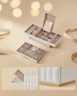【STYLE REDEFINED】The ANAH Collection—your ultimate jewelry storage solution—features a sleek, soft PU surface with intricate quilted stitching and unique pyramid-styled hardware, elevating your pieces and making a one-of-a-kind statement 【SPACIOUS, SECTIONED STORAGE】Uncover the cleverly-designed, expandable top layer and a drawer below, revealing dedicated compartments for rings, necklaces, bracelets, and watches. Each item is elegantly arranged for easy access and tidy organization 【VERSATILE, PRACTICAL DESIGN】Grab the detachable mirror for quick use or prop it on the partitions for instant reflection. Featuring 2 removable earring boards and 2 watch pillows, embrace adaptable storage solutions customized to your preferences 【ALL-AROUND PROTECTION】Crafted with a sturdy MDF frame and a water- and wear-resistant exterior that's easy to clean, this jewelry case with a floating base is designed for lasting protection. Its soft velvet lining protects your jewelry from scratches 【GIFT OF ELEGANCE】Behold the allure of this jewelry box, gracing your vanity, bedroom, dressing room, or living space. It's the perfect gift for special occasions, ideal for jewelry lovers who appreciate both style and practicality