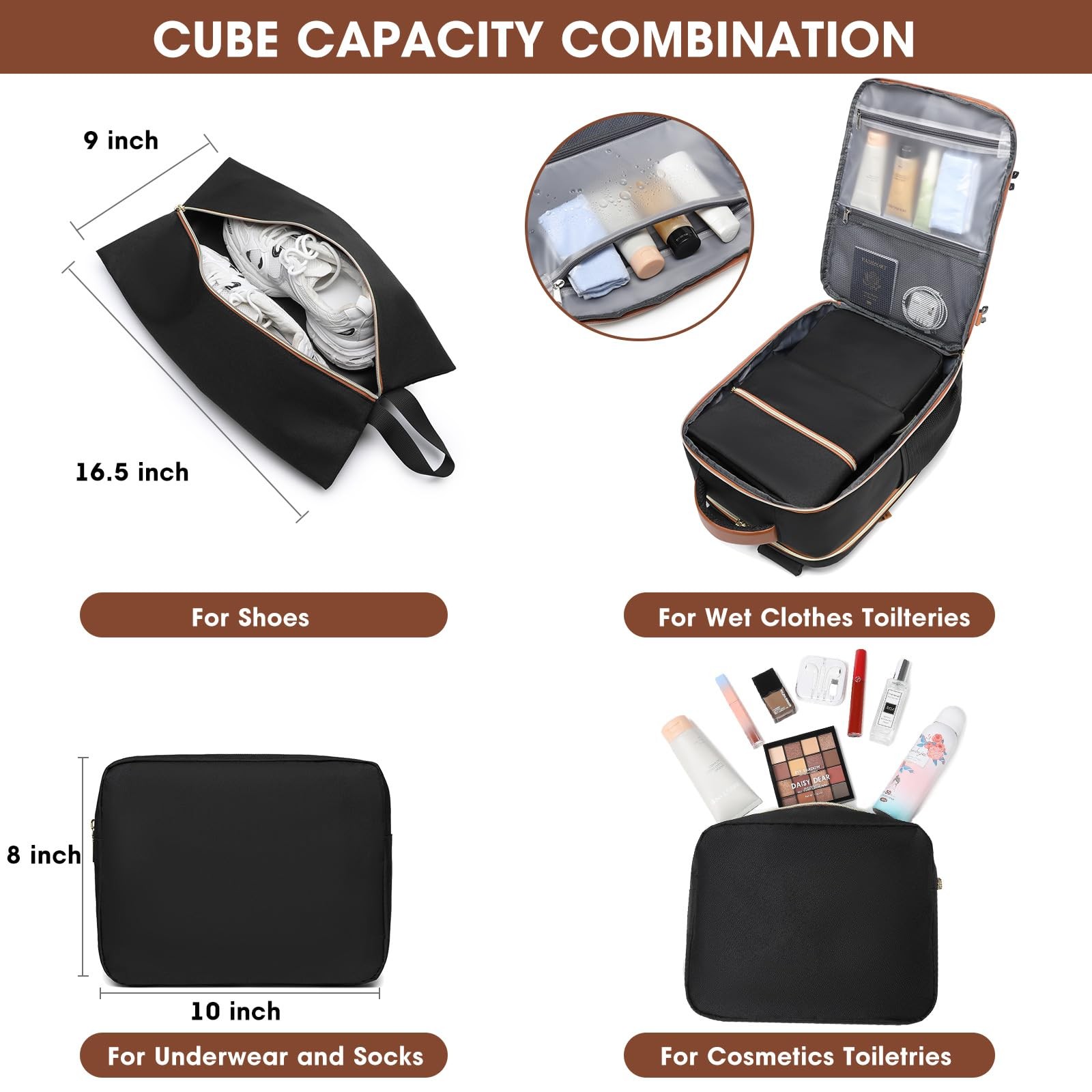 40L Carry on Backpack 18 x 13 x 8 inches travel backpack For 17.3inch Laptop 21 POCKETS TSA approved backpack Travel backpack personal item size Airport carry on backpack Travel backpack 40l Airline Approved Carry on Backpack: Travel backpack Size information: 18*13*8 inch (L x W x H). Weight:2.4lb. This tsa carry on backpack flight approved and fits under the seat or in the overhead compartment. The laptop compartment on the back and the main compartment can be opened 180 degrees, allowing you to easily pass through security checks without paying extra for the flight. Additionally, the two-way zippers provide added security, making it the perfect personal item for air travel 40L Capacity with Laptop Compartment: This extra large backpack offers more packing capacity up to 40L for your travel. Main compartment has enough storage room to store 8 to 10 clothes and daily necessities. It also has built-in elastic bands to keep your clothes from falling out. Elasticated side pockets holds a 32oz water bottle and umbrella pretty well. This luggage backpack is the best choice for women and men's vacation, weekend getaway, overnight and bussiness trip 3 Extra Packing Cubes & Wet Pockets: This airport carry on backpack comes with 1 shoe bag, 2 storage bag, One cube bag for toiletries such as makeup, cleanser, etc. One cube bag for underwear, socks, and small clothes neatly inside. The shoe bag is 16.5 inches/42cm long and can hold 1~2 pair of shoes. The built-in dry and wet separation bag to keep your things organized, and you do not worry making your backpack wet. Personal item travel bag convenient for your all travel things Practical Perfect Design: This large travel backpack with adjustable chest strap can effectively relieve the pressure on the shoulder and neck. And this airport carry on bag has handles on the top and one side. It can be a weekender backpack, overnight backpack, camping backpack, business backpack, University backpack, or casual daypack. You can use it anywhere USB Charging Port & Anti-Theft Pocket: This suitcase backpack adds a USB charging port design,uses a data cable to connect the power bank inside the backpack and the mobile phone outside,offers you a more convenient way to charge your phone(power bank NOT included). A hidden anti-theft pocket located on the lower back protects your valuable items, such as wallet, passport, ID card when traveling or lining up Durable Comfortable Backpack Perfect Gift: Our waterproof traveling backpack is made of sturdy, tearproof and water resistance canvas, comfortable and Durable. This Backpack is the best gift choice for your wife, girlfriend, mother, daughter, friends, etc. on birthdays, Thanksgiving, Christmas, New Year, and Valentine's Day. Believe in your choice and travel happily with your family