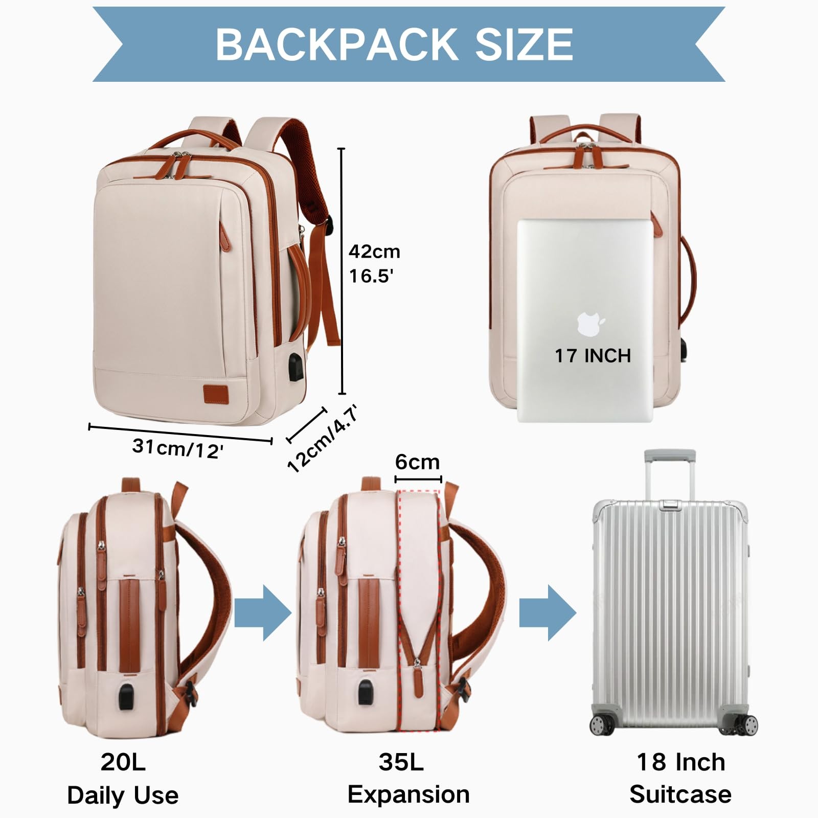 Expandable Laptop Backpack – Your Ideal Travel & Work Companion Stay organized, comfortable, and stylish with the Large Laptop Backpack, designed to meet the needs of commuters, college, and travelers. This multifunctional backpack is crafted from durable, waterproof fabric, offering a sleek and professional look while ensuring long-lasting performance. The backpack features a dedicated laptop compartment that accommodates laptops up to 15.6 inches, keeping your tech safe and secure. Its expandable design allows you to adjust the capacity to fit everything you need for business meetings, college classes, or short trips. With a built-in USB charging port, you can keep your devices powered on the go, making it an essential accessory for modern lifestyles. The breathable padded back panel and ergonomic shoulder straps provide exceptional comfort, even during extended wear. Whether you’re heading to work, college, or the airport, this versatile backpack offers a smart combination of functionality and style, ensuring it’s the only bag you’ll ever need. Choose and enjoy a blend of practicality, durability, and elegance in your everyday life. 【Convertible Design for Versatility】Easily switch between backpack and horizontal hand-carry modes for added convenience. Perfect for daily commutes, business trips, and casual travel. 【Expandable & Spacious Storage】Features an expandable capacity to fit all your essentials, with a dedicated laptop compartment that securely holds up to a 15.6-inch laptop. 【USB Charging Port for On-the-Go Power】Equipped with an external USB charging port and built-in charging cable, ensuring your devices stay powered throughout your busy day. 【Durable & Waterproof Material】Made from high-quality, water-resistant fabric that is soft to the touch yet durable enough to withstand everyday wear and tear. Ideal for college, professionals, and travelers alike. 【Comfortable & Breathable Back Support】Ergonomic design with breathable padded straps and back panel for all-day comfort, keeping you cool and reducing strain on your shoulders.