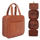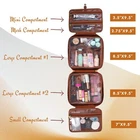 Large Hanging Leather Toiletry Bag | Dopp Kit With Foldable Compartments Easy to organize mens leather toiletry bag: 2 large main double zippered compartments with elastic bands to hold bottles or brushes, 1 medium copartment, 2 small compartments with mesh partition and 1 external small pocket Convenient to use - see-through zip pockets and main compartment for providing clear overview of contents. Top handle is easy to carry. Two-way zipper closure for quick access of men's leather toiletry bag Special design toiletry bag for men leather hanging - inner pockets with elastic straps hold bottles upright. Stow-away 360 degree swivel non-slip metal hook for versatile hanging options Waterproof design - made with premium water-resistant inner material, keeping inside items secure and prevents leakage. Leather shave kit bag is lightweight and durable. Multipurpose mens toiletry bag leather - unique design allows you to get a toiletry bag, shaving kit or makeup bag / cosmetic bag, all in one. It's a great choice for business trips, travel, gym, camping, home use and more; also a great gift to women and men