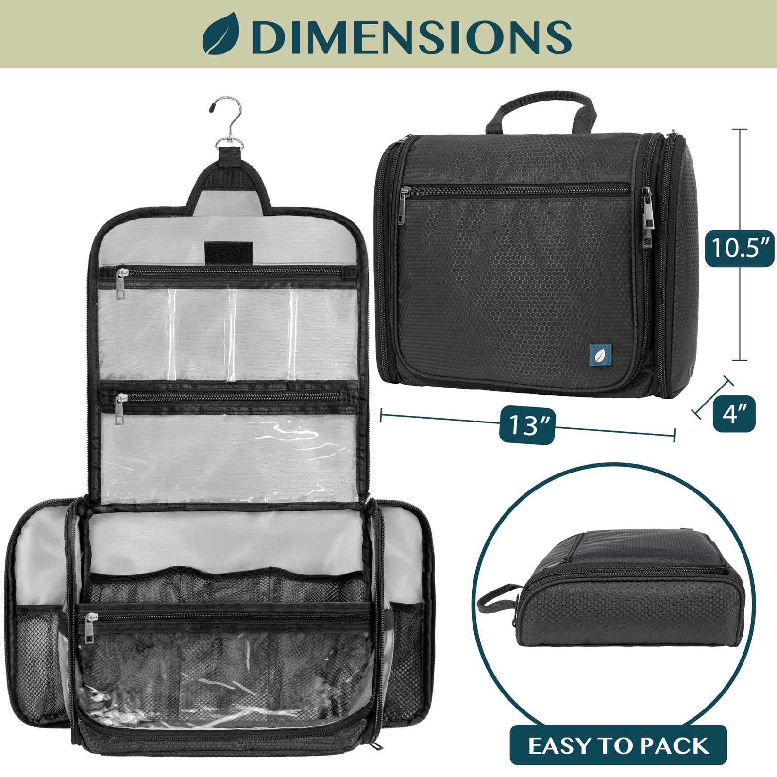 LARGE HANGING TRAVEL TOILETRY BAG: large travel bag toiletry organizer case with dimensions of 13 x 4 x 10.5 inches when folded and 13 x 20 inches when unfolded. It has a large central compartment and 2 side pockets to fit all your travel toiletries containers, makeup, and cosmetic bottles. Main compartment has 3 mesh pockets to fit skincare bottles, shampoo while side smaller pockets are designed to hold make up brush, toothbrush. COSMETICS TRAVEL BAG ORGANIZER: This toiletry bag for women has a hanging hook and multiple pockets that help you stay organizer during business trip, vacation travel. The hanging hook makes it easy to hang the toiletry bag to bars in the hotel shower bathroom. Unzip your toiletry bag to reveal compartments to organize your shampoo, skincare face hygiene products. This toiletry travel bag is an essential accessory for cruise in Europe, plane, Hawaii Trip, and honeymoon. PADDED MAKE UP BAG CASE: The toiletry case bag for men has foam padding that protects toiletries container, shampoo bottle during flying, roadtrip, and plane. The toiletry bag kit also has elastic bands that secure makeup brush, face spray, lipstick, shaving razors. 2 waterproof compartment for wet toiletries. This large hanging toiletry bag holder for women will protect all gear, cosmetics, and travel gadgets. This is a travel must have for vacation, flying, gym, cruise, and home. PACKABLE TOILETRY BAG GIFT: Large and portable, this compact hanging toiletry bag is perfect for business trips, traveling, gym shower, camping, dorm, home use. Easily fit this in any luggage and suitcase. This is a great travel toiletry gift set for travelers, women, men, flight attendants during Birthday, Christmas, holidays, and vacation. Also makes a great gift for mother, father, friend,wife and husband gift during Valentine Day. EASY TO CLEAN: Simply wipe clean with damp cloth to maintain the toiletry bag travel bag. With its water resistant polyester fabric and waterproof compartment, this travel kit for women keeps your travel-size item, shampoo, conditioner, lotion, face wash, medicine, toothpaste, toothbrushes, hair brush and daily makeups protected and organized for every trip, cruise, flight! A must have for every travel packing list!