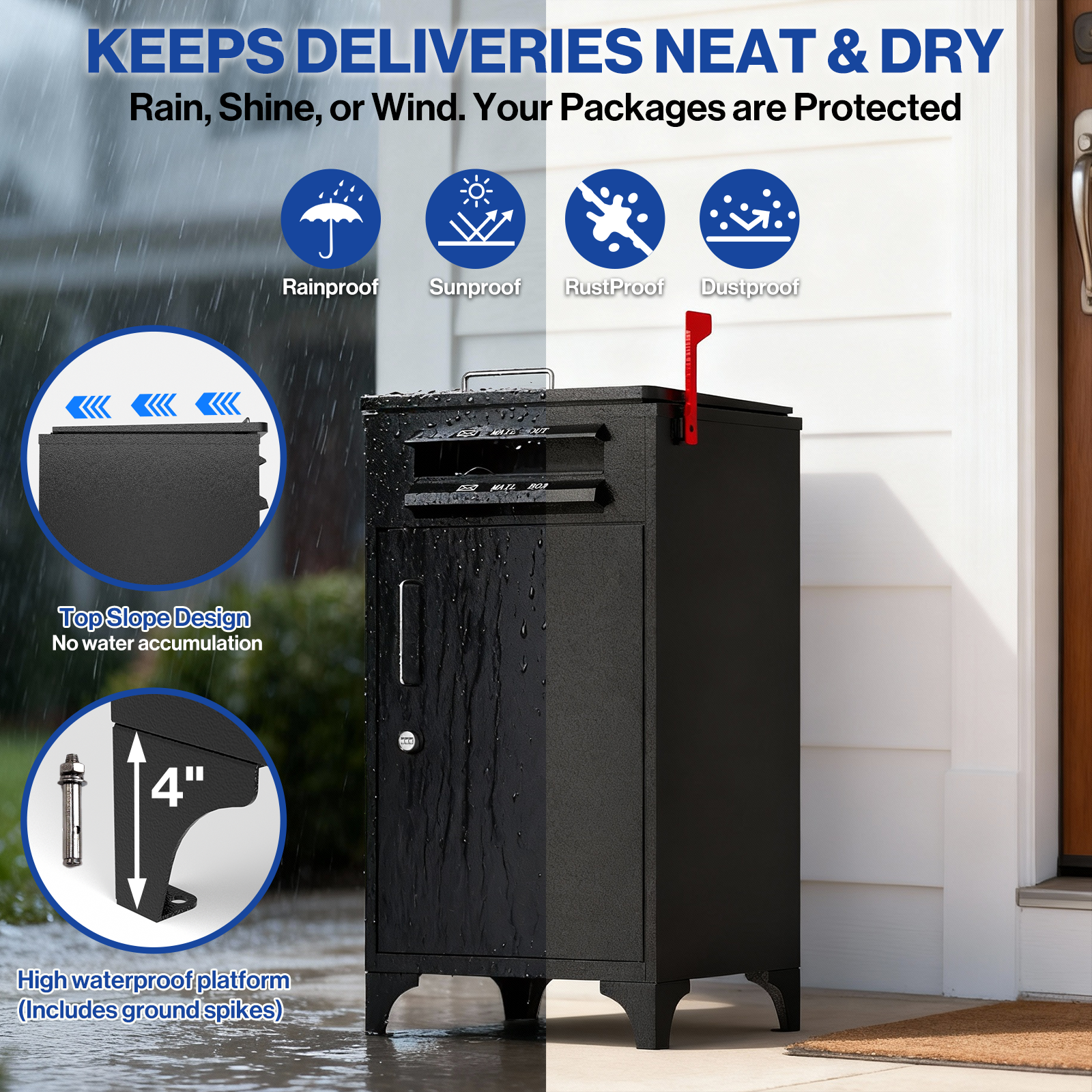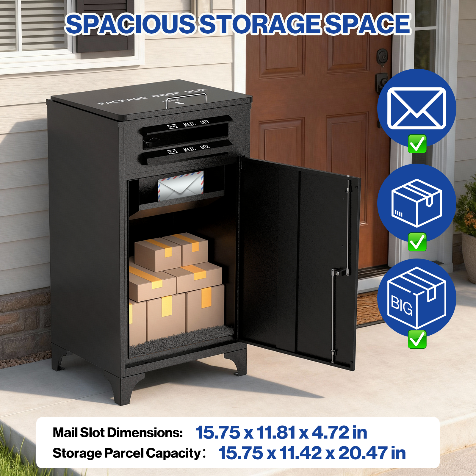 POCHAR Large Package Delivery Boxes for Outside, Heavy-Duty Steel Parcel Drop Boxes with Anti-Theft Design for Home, Large Waterproof Package Lock Box with Coded Lock for Outdoor, Porch, Curbside 【Extra Large Capacity】POCHAR extra large mailbox offers oversized space for multiple large packages, plus all your other curbside mailbox deliveries. Dimensions: L21.26 x W18.43 x H39.37 inches. Suitable for various package sizes. Features separate compartments for letters and packages, enabling organized storage. This parcel box comes with pre-drilled holes, a sturdy combination lock, and a complete set of mounting hardware for easy assembly. 【Durable, Weatherproof Design】parcel box boasts a galvanized steel structure with effective waterproof and rust-resistant properties for lasting durability, keeping packages safe and dry. Four raised feet on the bottom keep the box elevated above standing water, while the cabinet anchors securely to the ground. The sloped roof design facilitates natural runoff of rainwater and snow, eliminating water accumulation risks. Comprehensive Package Protection. 【Multi-Layer Anti-Theft Security】The POCHAR outdoor delivery box features a secure combination lock and internal hinges for package safety. The delivery slot includes a large anti-theft baffle, reinforced screws, and hydraulic support rods to prevent theft and absorb impact. Full-process protection for your packages. 【24/7 Secure Package Delivery】Couriers can safely deliver parcels around the clock without requiring you to wait at home. The keypad lock eliminates worries about lost keys, hiding spots, or complicated operations—ideal for remote workers, frequent travelers, and anyone seeking a convenient delivery experience. 【Multi-scenario & Customizable】Offers customizable address stickers to guide delivery personnel to outdoor locked mailboxes. Perfect for homes, apartments, porch, yardor, curbside, and businesses, providing a reliable solution for all your delivery needs. Pochar's customer service team provides 24-hour service. This is a Brand New product If you would like an Open Box discount, please visit our store front to see more listings. Contact us through Ebay for any questions Our dedicated Customer Service is here to help Monday to Friday (9am to 5pm PST) All POCHAR products are sold with a one (1) year manufacturer warranty including replacement parts. Check our Store Front for more product listings! POCHAR Sales | Store Front Thanks for shopping POCHAR! The actual color of the product may be different from the image you see. This is due to the fact that every computer monitor, laptop, tablet and phone screen has a different capability to display colors and that everyone sees these colors differently. We try to edit our photos to show all of our products as life-like as possible, but please understand the actual color may vary slightly from your monitor.