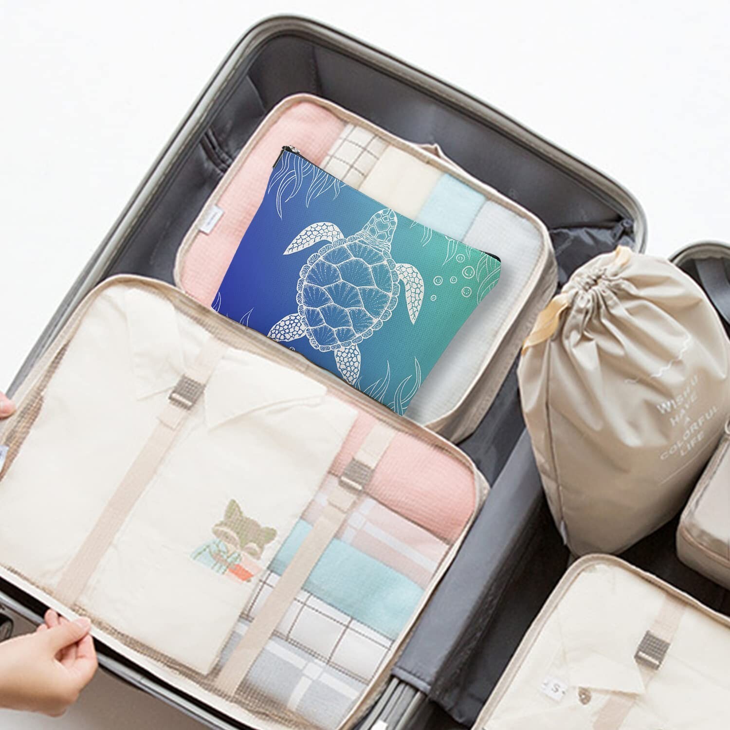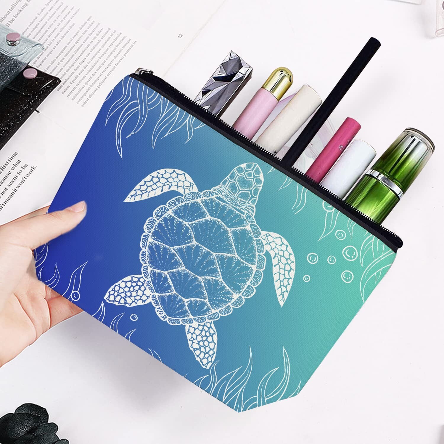 Makeup Bag for Women Large Travel Cosmetic Zipper Pouch Toiletry Bags 7X10in Turtle Blue Ocean, 7X10 in Product Details Product Dimensions: 10 x 7 x 0.5 inches Item Weight: 1.44 ounces Department: Women Item model number: HZB0409017 Large 7 x 10 inch size provides ample storage yet remains lightweight for portability Durable cotton and linen material with waterproof coating keeps contents protected Features a stylish animal print design and sturdy zipper closure perfect for travel Vibrant, fade-resistant thermal printing ensures long-lasting colors and patterns Multi-purpose use as a makeup, toiletry or cosmetic bag - ideal for trips, gym, or home organization Makeup Bag for Women Large Makeup Bag Travel Cosmetic Bag Zipper Pouch Toiletry Bags 7X10inLARGE SIZE:7X10in,large enough but lightweight.MATERIAL:100% Cotton and linen,soft and portable,waterproof coating.DESIGN:Double-sided printing.Featuring a sleek black zipper with a silver pull.Perfect for daily use or travel.HIGH-QUALITY PRINTING:High-quality thermal transfer printing,making its patterns bright and easy to fade.NOTE:do not use bleach to clean.MUlTIPURPOSE:Not only used as a makeup bag,also a toiletry bag and cosmetic storage bag,great for daily use,vacation,business,gym,camping and bathroom organization.