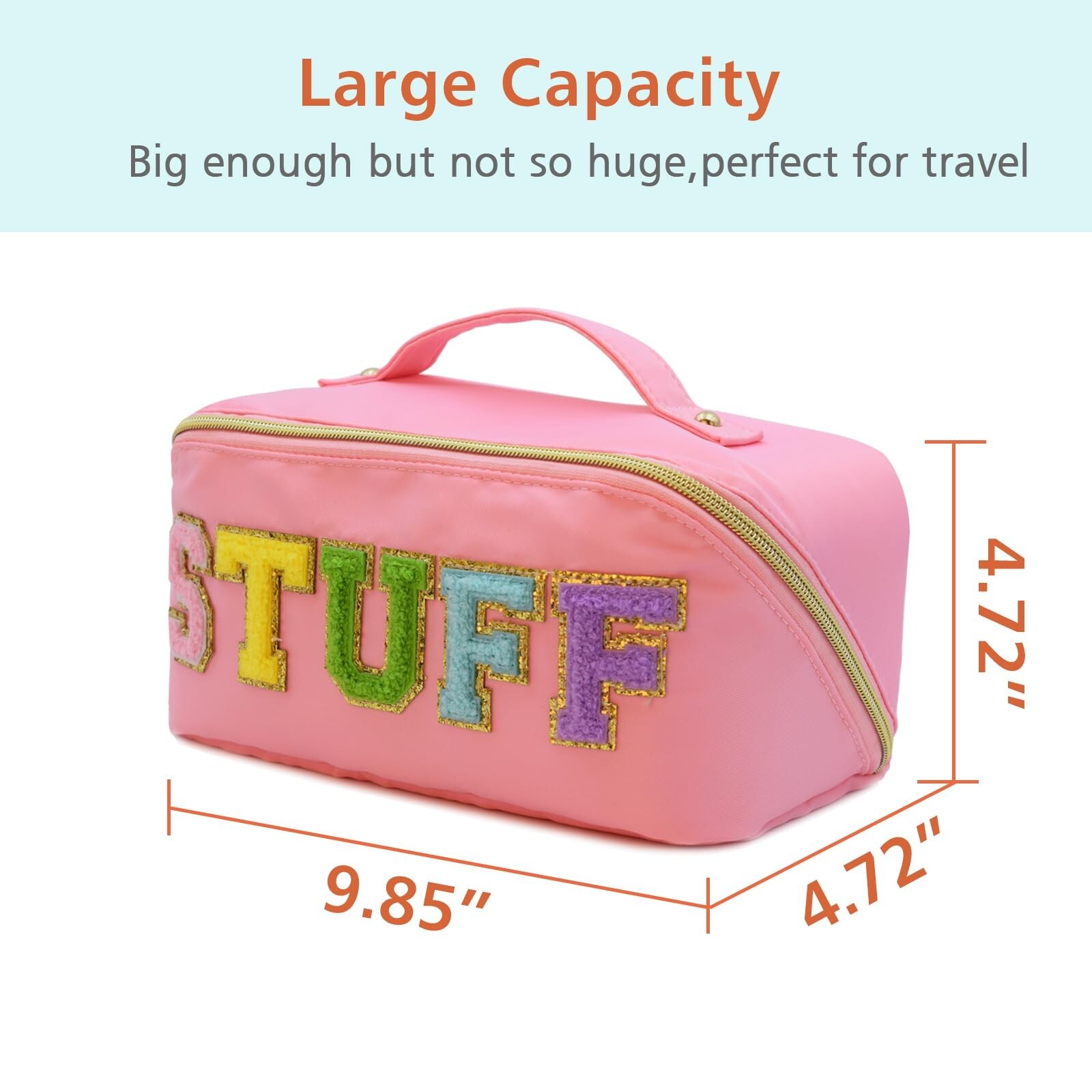 Travel Makeup Bag,Large Capacity Cosmetic Bags for Women,Portable With Handle and Divider Pouch Wide Open Flat Lay Organizer,Toiletry Bag with Chenille Letter (Pink) Product Details Color: Pink Brand: Rebex MPN: Cb01 UPC: 717373496681 EAN: 0717373496681 Product Dimensions: 9.84 x 4.72 x 4.72 inches Item Weight: 0.634 ounces Department: Womens Country of Origin: China Item model number: Cb01 Large Travel Makeup BagThe large capacity travel makeup bag divided into 2 main compartments with 3 pockets in two sides.The multiple compartments and pockets keep everything organized.Its big enough but not so huge that it would take up to much space in your luggage. Easy Access Super malleable shape, allows you to load it up, and add all sorts of things inside! The convenient structure of 180o opens up to lay flat when unzipped, so you can easily find everything.Saving you precious time when you are on the go. Bright and CuteSuper cute cosmetic bag and compact yet holds a lot for traveling,sleek and very functional.The preppy patch design adds a touch of style, making this makeup bag both practical and fashionable. Highly recommended for anyone looking for a functional and trendy cosmetic bag. Nylon Waterproof MaterialThis cosmetic bag made of a stronger nylon material.It is durable,waterproof and easy to clean,making it perfect for travel or everyday use.The colorful "STUFF" letters are sewn on well.This creationary elements cater to the new era of women's demand for new fashion.