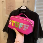 This makeup bag is a game-changer for travel! The spacious design fits all my essentials, and the smart dividers keep everything organized. The sturdy handle makes it easy to carry, and the cute pink chenille letter adds a stylish touch. Perfect for keeping my cosmetics neat and accessible—love how it lays flat for quick packing. Highly recommend for anyone who needs a reliable, roomy toiletry organizer!