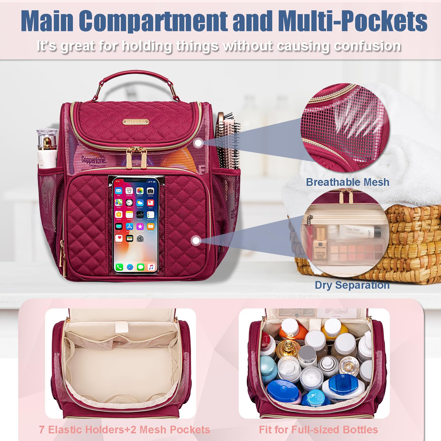 Hanging Toiletry Bags for Organization - Portable shower caddy bag has an upgraded size of 12.2'' x 11.2'' x 7.1'' (L x H x W), Travel toiletry bag for women providing ample room to store towels, toiletries, and beauty products. bathroom caddy bag with its generous space, it helps keep your bathroom clutter-free and orderly. It can easily accommodate full-sized bottles and a variety of items, ensuring you have everything you need within reach. Travel Toiletry Bag with 2-in-1 Front Pouch - The portable shower caddy's front pouch is not just for small items. It's also a phone holder. With the waterproof layer, you can control your phone's screen. Listen to music, send emails or watch videos. No more missing important calls or messages. A great 2-in-1 feature for staying connected in the shower or while getting ready. Quick Drying Travel Toiletry Bag - Cosmetic travel bag made of premium waterproof oxford fabric and PVC breathable mesh materials, bath caddy is designed for durability and functionality. makeup organizer with reinforced seams in the hanging portion make it is not easy to tearing. The mesh design on the top front allows for easy drainage and ventilation, keeping your items dry and preventing moisture buildup. Toiletry Bag for Women with Compartments - Toiletry organizer features multiple compartments and holders for optimal organization. It has 1 main compartment, 4 zipper pockets for smaller items, and the interior of the large makeup bag contains 7 different sizes of elastic straps for holding toothbrushes, facial cleansers, bottles, and more. There are also mesh pockets on both sides for additional storage and a waterproof phone bag for convenience. Easy to Carry and Use - Travel shower bag for women with a two-way zipper that is smooth and easy to operate, a wide handle for comfort. Travel case for toiletries is highly portable. equipped with a durable, anti-rush hook. This allows you to hang it on a shower curtain rod, door, or wall hook, providing easy access to your shower necessities while showering.It makes travel more convenient in various places. Multipurpose and Ideal Gift - Suitable for daily bathing and storage, college shower caddy can be used in college dorms, gyms, bathrooms, camping, travel, and more. It is a multi-functional travel makeup bag or cosmetic bag for women that can be folded to save space when not in use. Additionally, it makes a perfect gift for family, friends, women and men on various occasions such as birthdays, Festivals, Christmas